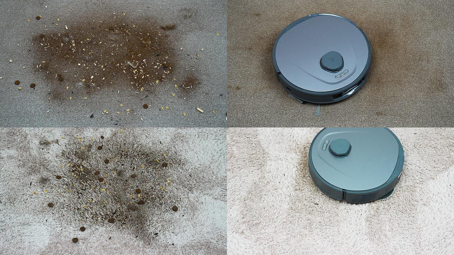 Be to, ant trumpo plauko kilimo buvo išbarstytos šiukšlės. Galiu pasakyti, kad „3i P10 Ultra“ kruopščiai išvalė kilimą. Jis taip pat gali išvalyti vidutinio plauko kilimą, bet ne taip gerai. Krūvoje liko minimalus šiukšlių kiekis. Tikėtina, kad robotui tiesiog trūko galios, o fiksuotas centrinis šepečio mazgas prisidėjo prie problemos.