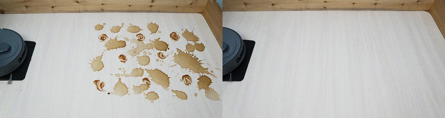 Valant sunkiai įveikiamas dėmes, robotas netgi sugebėjo pašalinti pridžiūvusias kavos ir padažo dėmes. Ir ne iš pirmo karto. Tiksliau, iš septinto. Ir tai labai geras rezultatas! Panašių robotų dulkių siurblių standartas yra 10 plovimų.