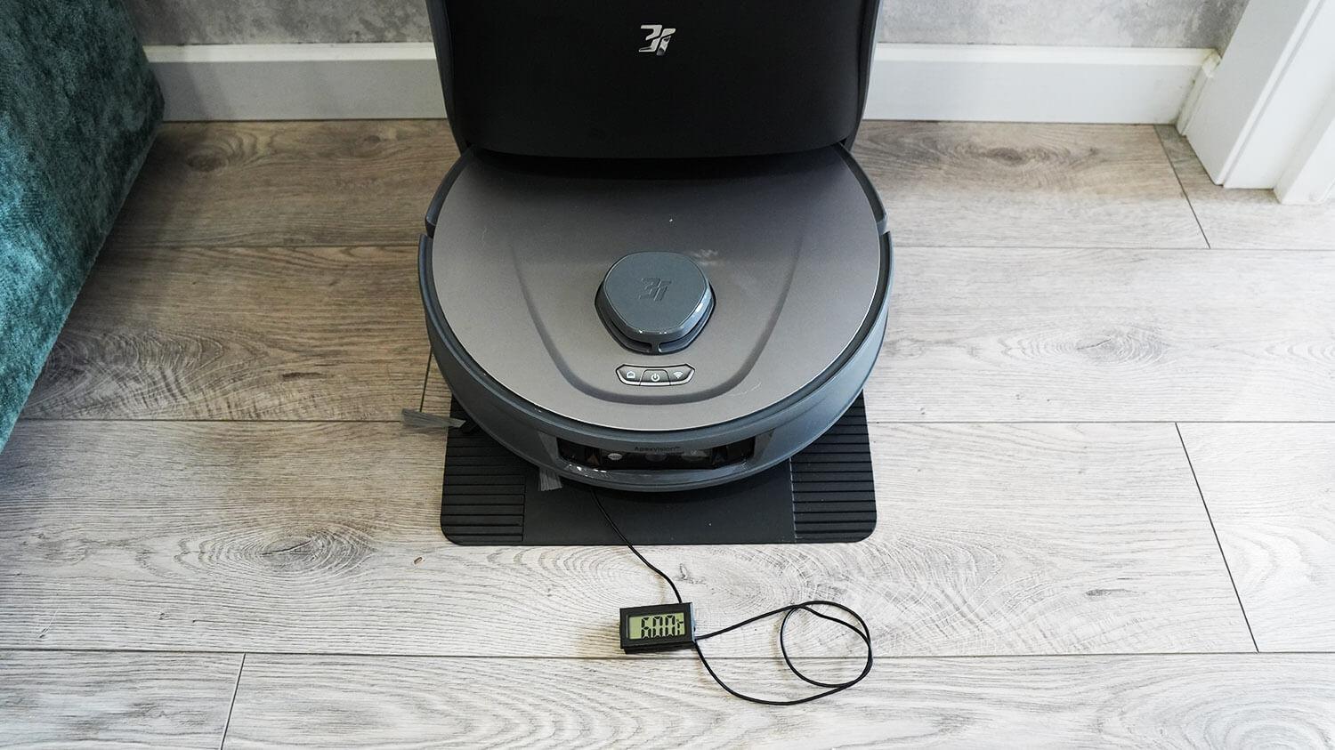 Taip pat išbandžiau baterijos veikimo laiką, kai robotas veikė maksimaliu galingumu ir įjungė šlapio valymo režimą. Jis veikė 112 minučių, išvalydamas 92 kvadratinius metrus naudingo ploto. Iš tikrųjų to daugiau nei pakanka dviejų miegamųjų butui išvalyti du kartus. Tačiau turėčiau atkreipti dėmesį, kad yra valymo tęsimo režimas po įkrovimo bazėje, todėl šis modelis gali išvalyti dvigubai daugiau. Mano nuomone, roboto baterijos veikimo laikas yra labai geras.