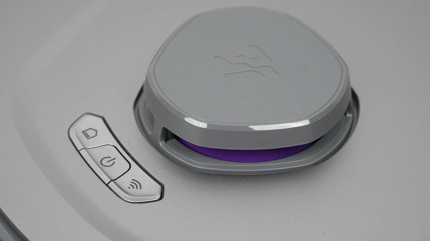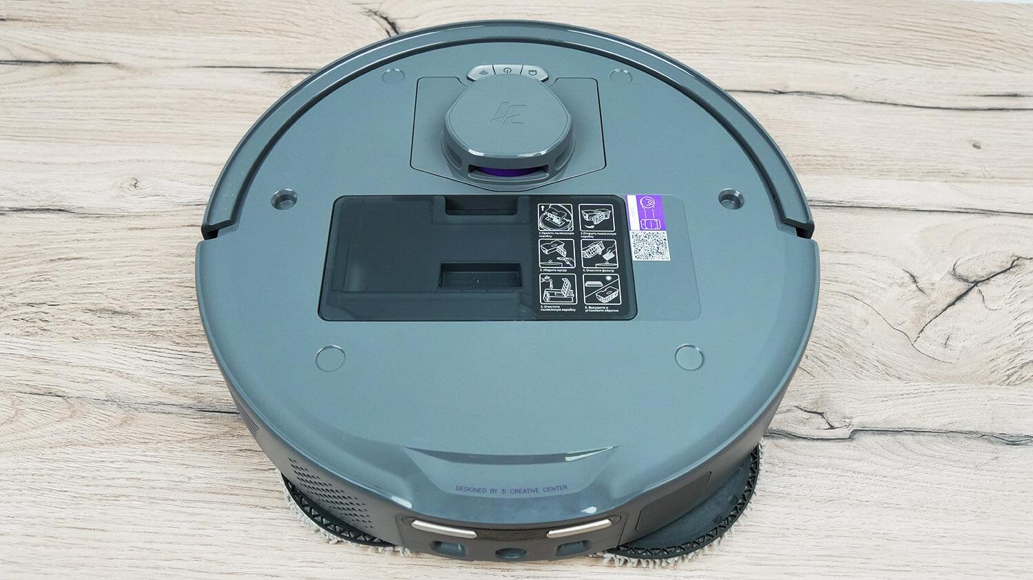 300 ml dulkių konteineris yra po viršutiniu dangteliu. Ten pat yra QR kodas, skirtas robotui prijungti prie programėlės.