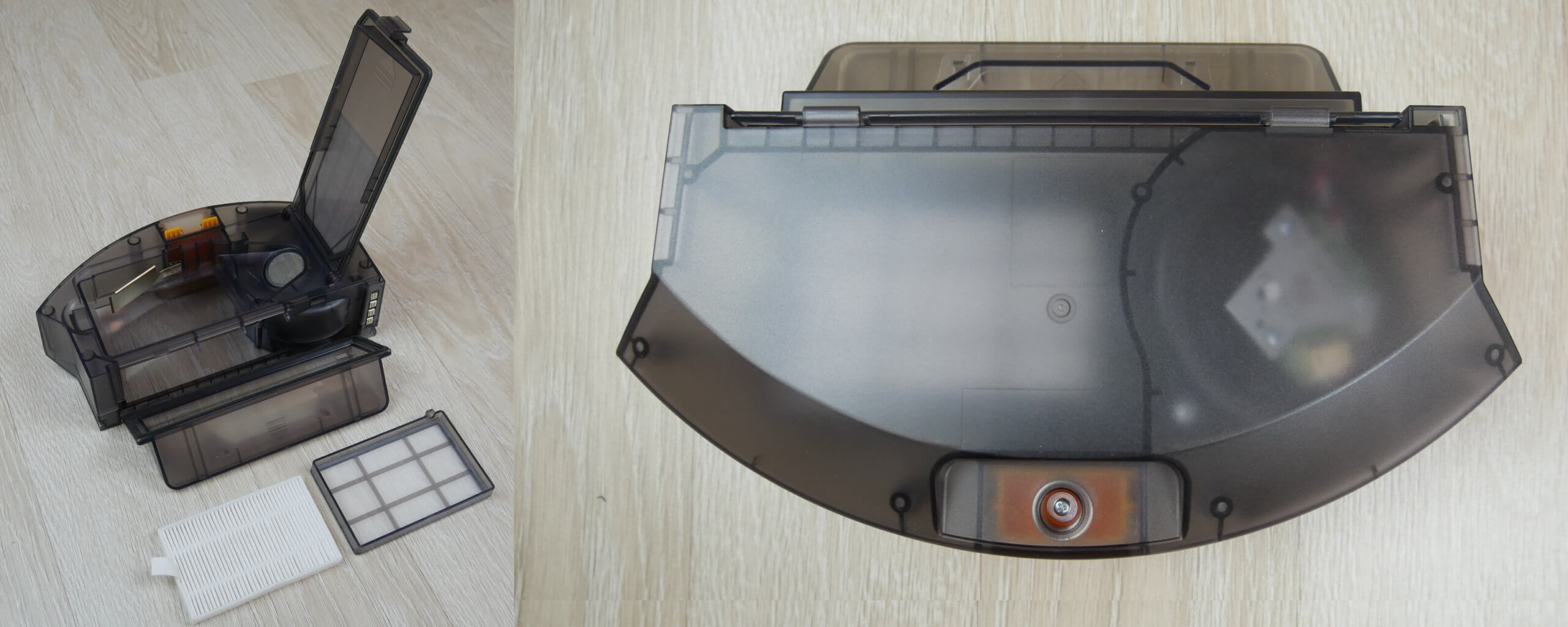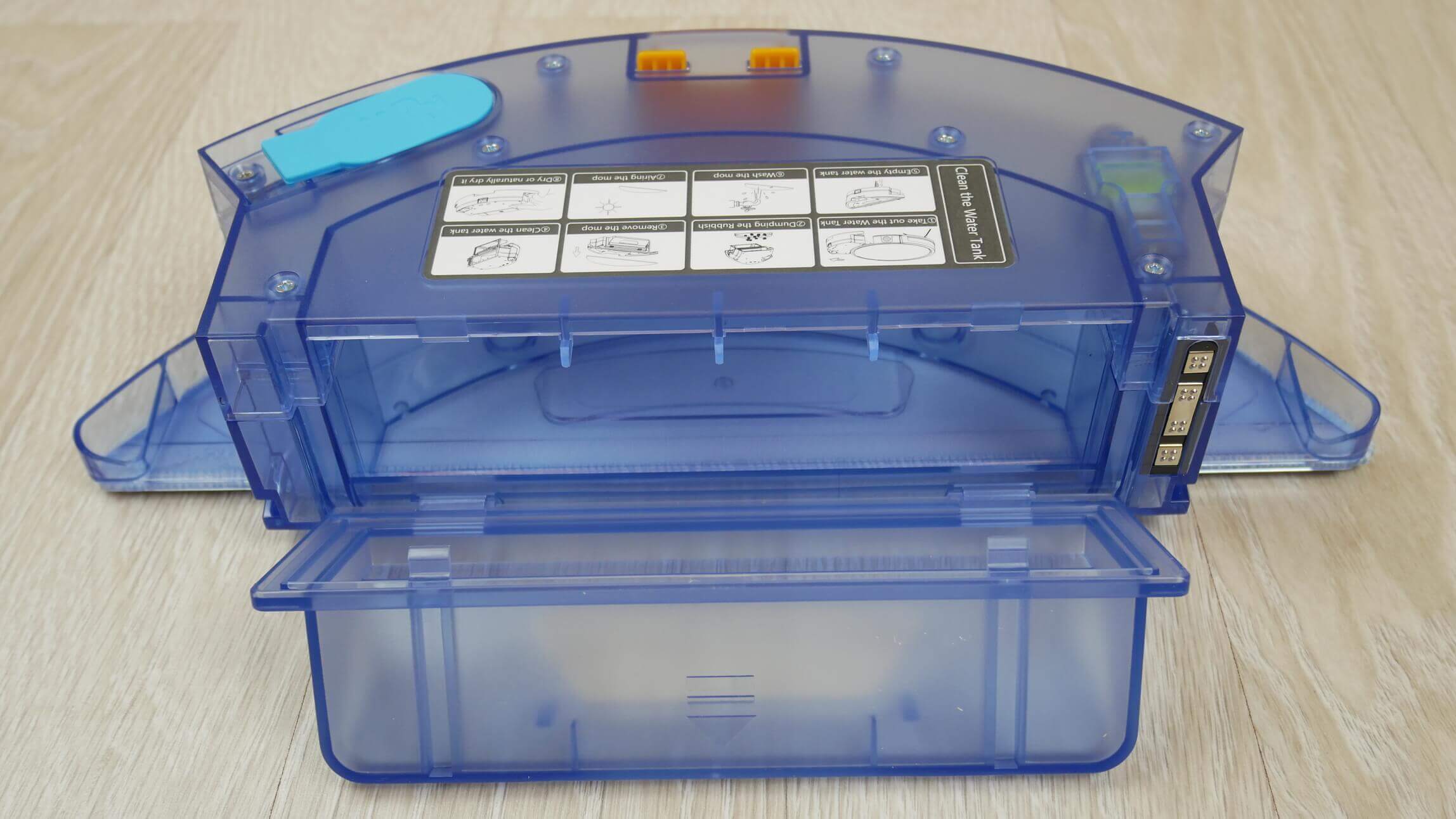 Vietoj dulkių surinktuvo robotas dulkių siurblys gali būti aprūpintas vandens baku, kuris, pasak gamintojo, talpina iki 360 ml. Jame yra nedidelis skyrius šiukšlėms surinkti.