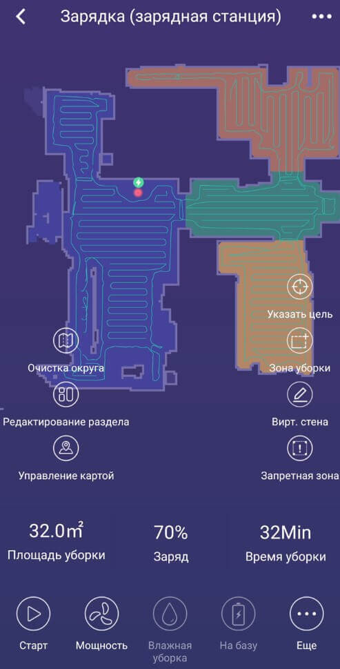 Apatinėje mygtukų eilutėje valdomas valymo proceso paleidimas ir sustabdymas, siurbimo galios, vandens srauto greičio reguliavimas, kai įdėtas vandens bakas, ir roboto priverstinis grįžimas į įkrovimo bazę. Paspaudus mygtuką „Daugiau“, atrakinamos papildomos funkcijos, įskaitant roboto paiešką pagal garsą, vietinį valymo režimą ir rankinį valdymą.