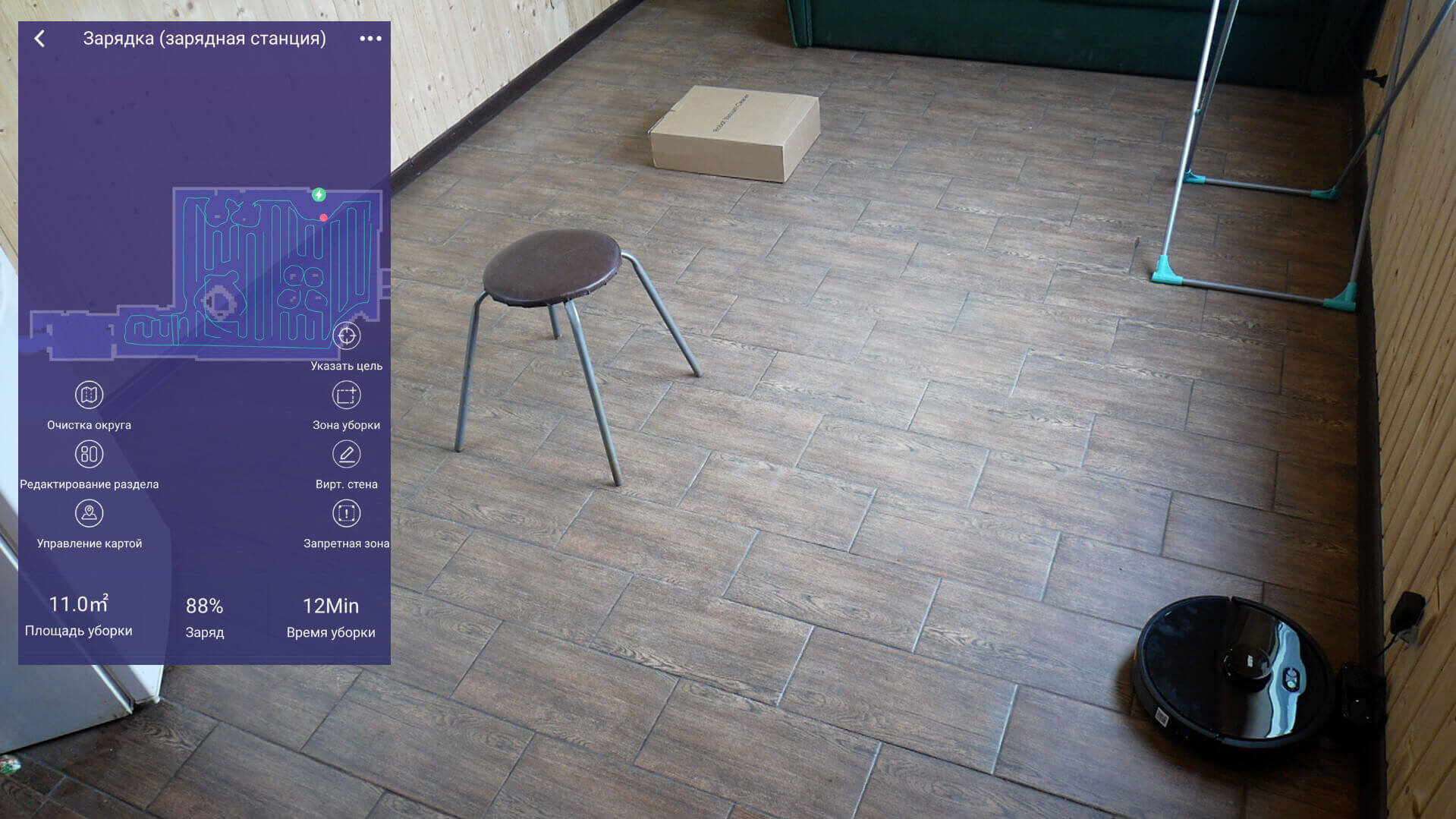 Pirmiausia išbandėme „Abir X8“ navigaciją kambaryje su kliūtimis. Robotas dulkių siurblys pirmiausia išvalo pasiekiamos zonos perimetrą, o tada persijungia į vingiuotą judėjimo modelį. Jis sugebėjo išvalyti aplink kiekvieną kėdės koją ir dėžę neužstrigdamas ant džiovyklės. Nebuvo neišvalytų vietų, o maždaug 11 kvadratinių metrų ploto valymas užtruko 12 minučių. Valymo greitis yra geras, ir testas buvo sėkmingai išlaikytas.