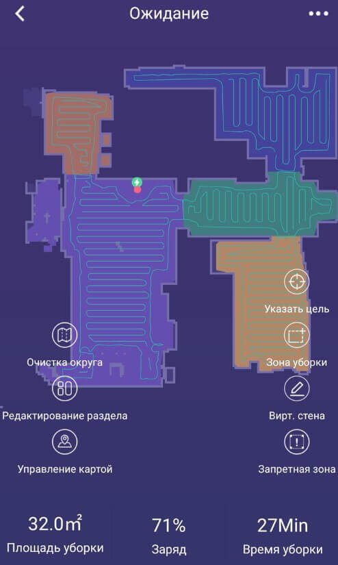 Po įvadinio važiavimo žemėlapis pasirodo pagrindiniame prietaisų skydelyje. Robotas automatiškai suskirstė jį į zonas, o tai yra privalumas.