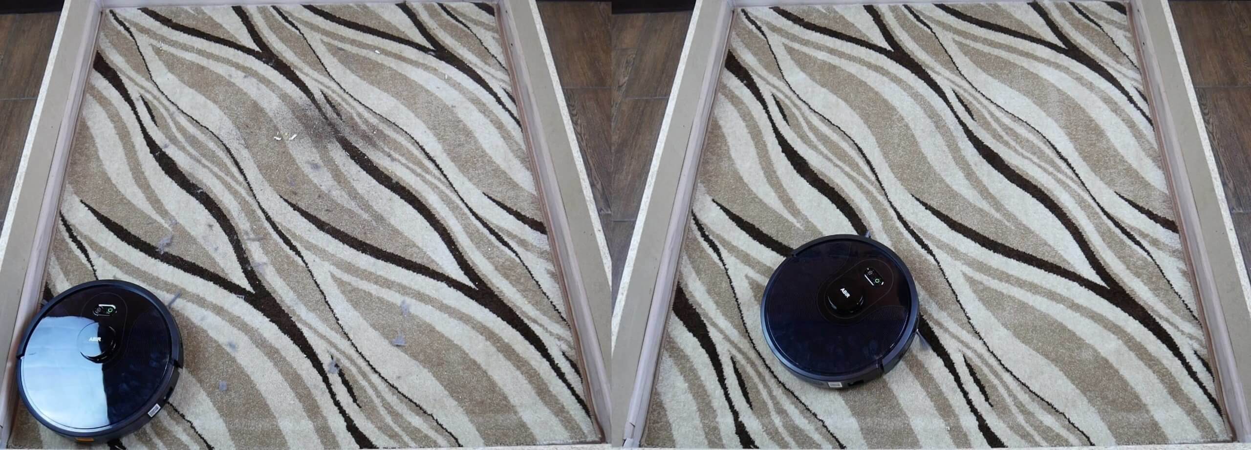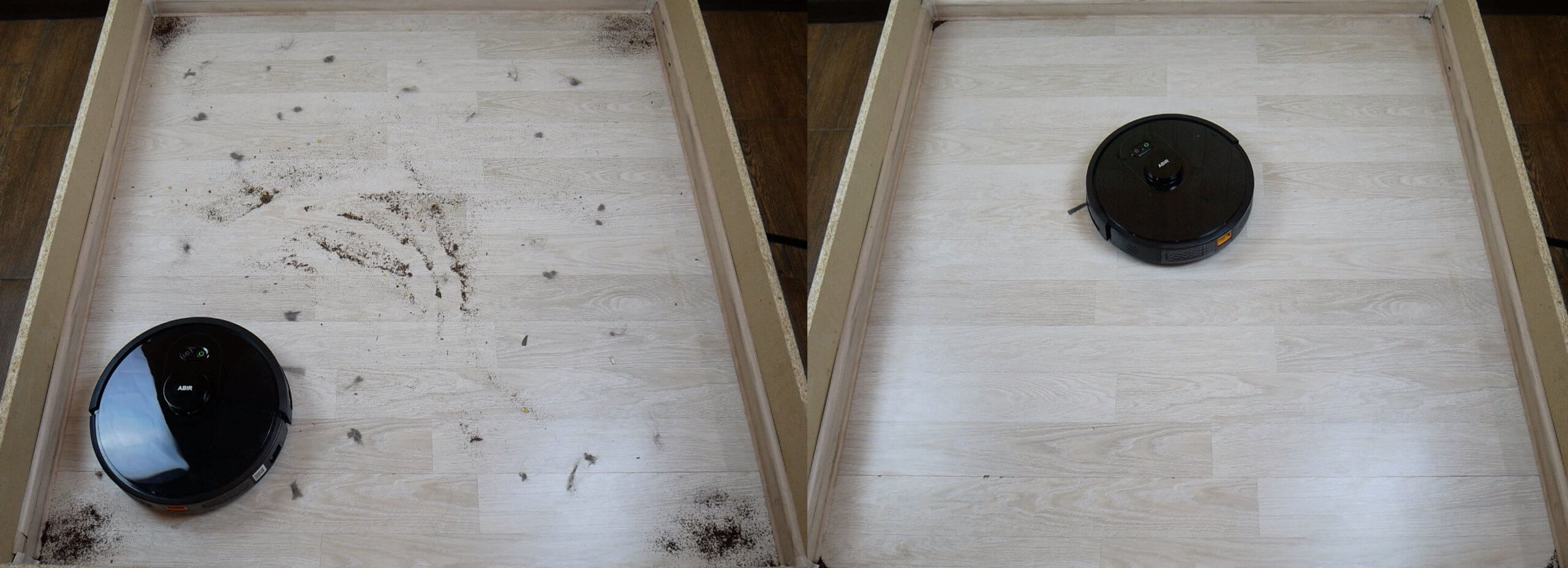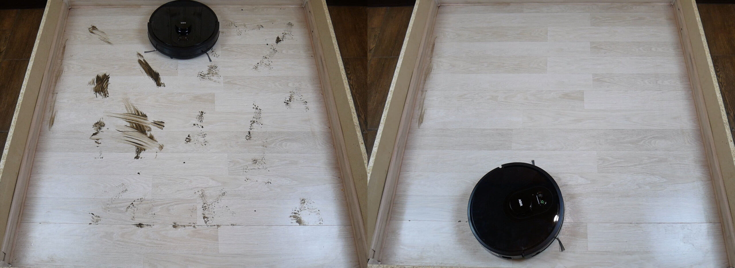 Kalbant apie šlapią valymą, šis robotas dulkių siurblys grindis valo Y formos raštu, kaip grindų blizgintuvas. Tai leidžia robotui efektyviau pašalinti nešvarumus nuo grindų, ir šis bandymas tai patvirtina. Net ir su tokiu nešvarumų kiekiu robotas sugebėjo išvalyti viską. Neliko dėmių, o dryžių buvo minimaliai, tačiau taip yra dėl to, kad pati šluostė buvo užsikimšusi nešvarumais.