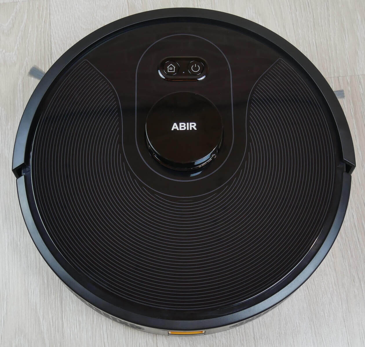 Dabar pažvelkime į patį robotą dulkių siurblį. „Abir X8“ yra apvalus ir blizgios juodos spalvos. Viršutinėje korpuso dalyje sumontuotas navigacijos jutiklis. Šalia jo yra du valdymo mygtukai: paleidimas / pristabdymas ir grįžimas į įkrovimo bazę. Beje, pats jutiklis turi mechaninį mygtuką, kuris neleidžia robotui įstrigti po baldais.