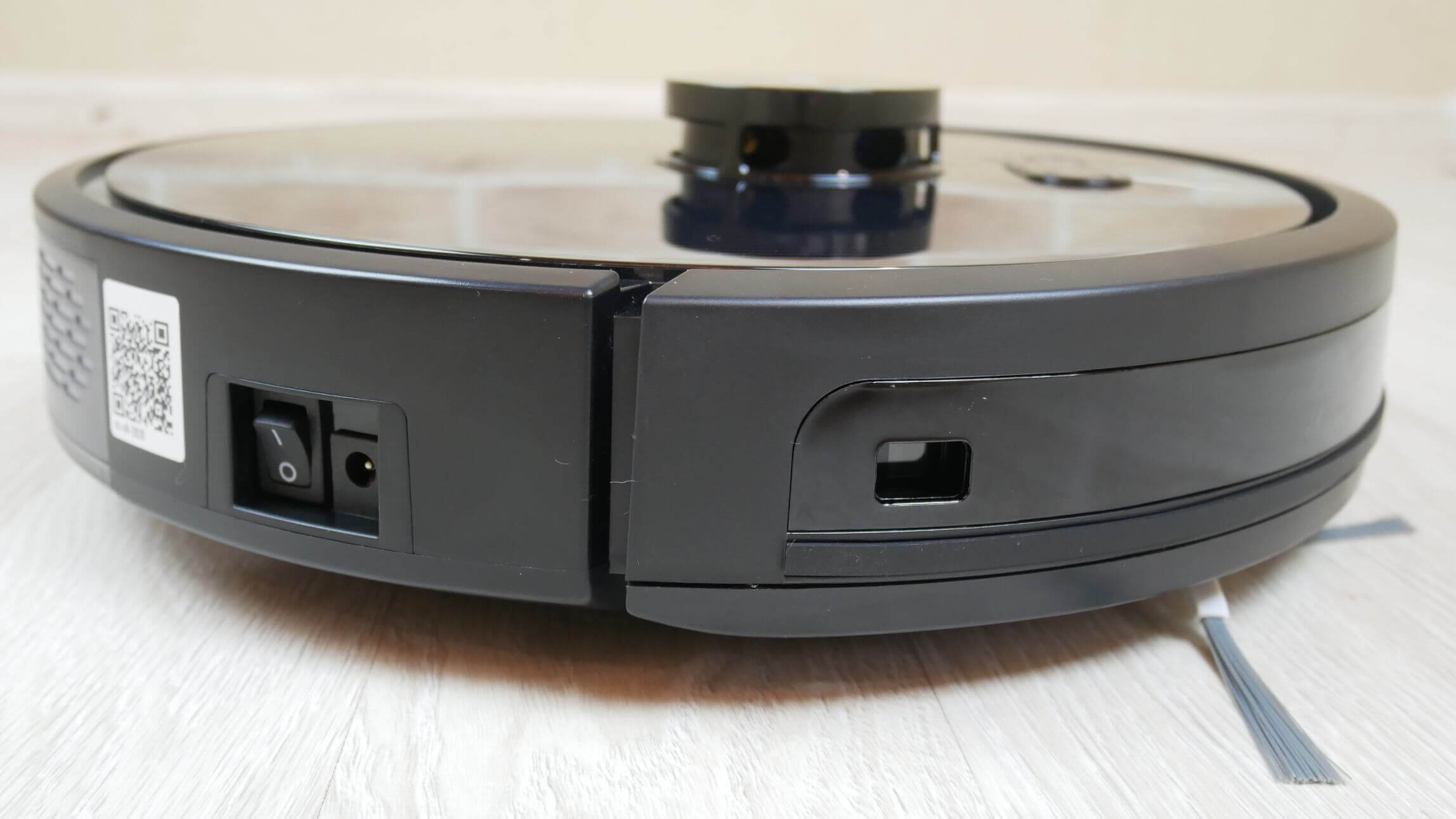 Svarbu atkreipti dėmesį, kad korpuso aukštis yra maždaug 96 mm. Priekyje sumontuotas minkštas mechaninis buferis. Dešinėje buferio pusėje yra sienos aptikimo jutiklis, dar žinomas kaip ToF jutiklis. Tai padeda robotui judėti kuo arčiau sienų, kad būtų galima kruopščiau išvalyti.