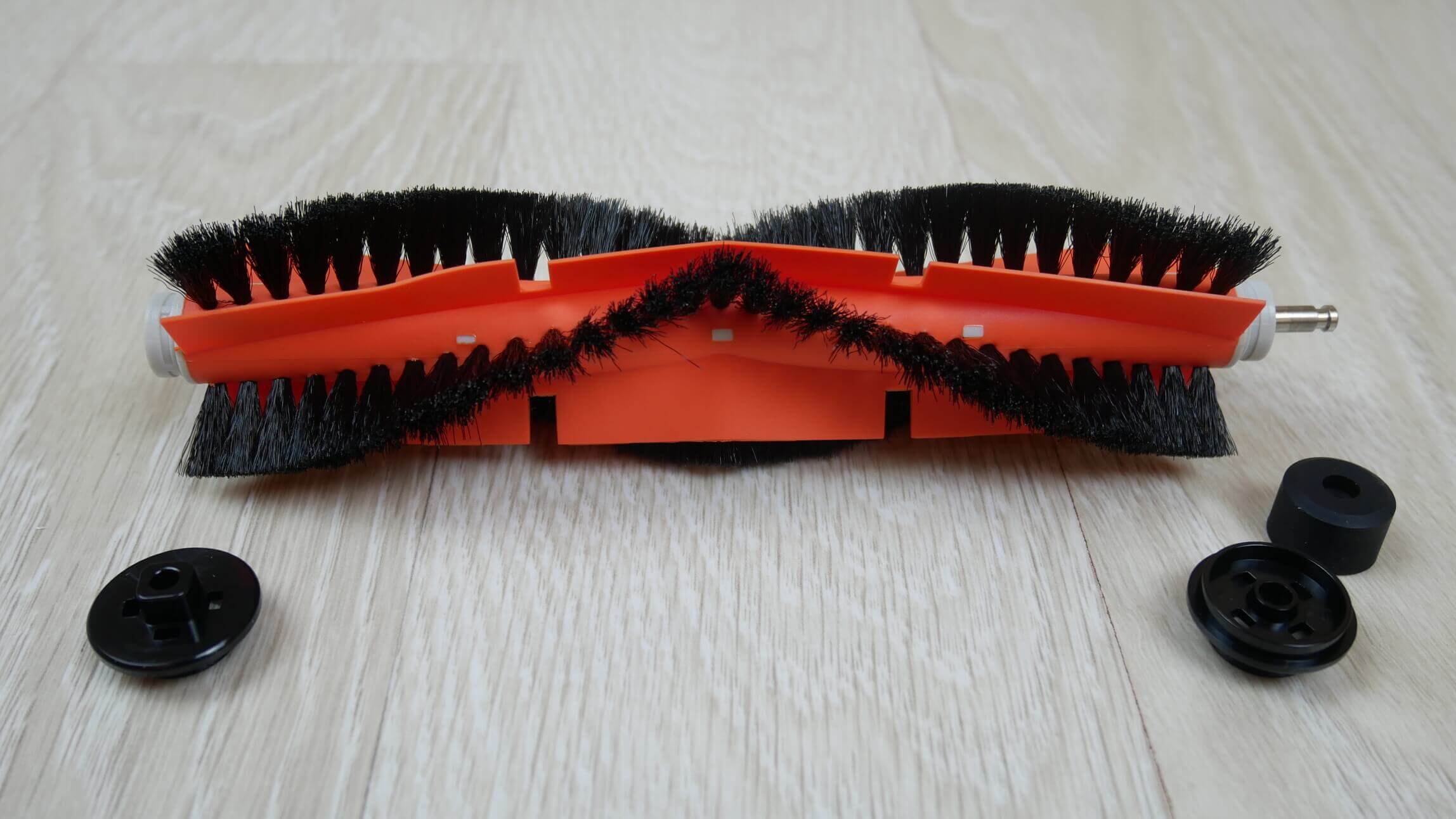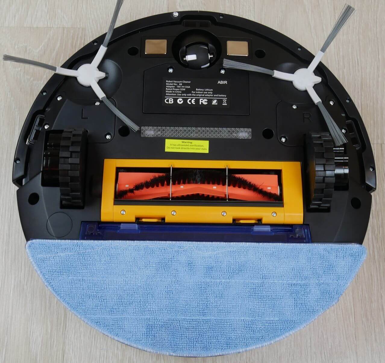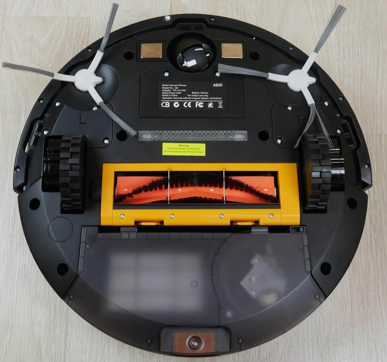 Pažvelkime į „Abir X8“ apačią. Jame yra du šoniniai šepečiai. Jie yra trijų dalių, greitai atleidžiami ir turi šerelių kutais puoštus antgalius. Jie taip pat turi papildomą apsaugą nuo plaukų susivėlimo šonuose. Apačioje yra trys apsaugos nuo kritimo jutikliai.
