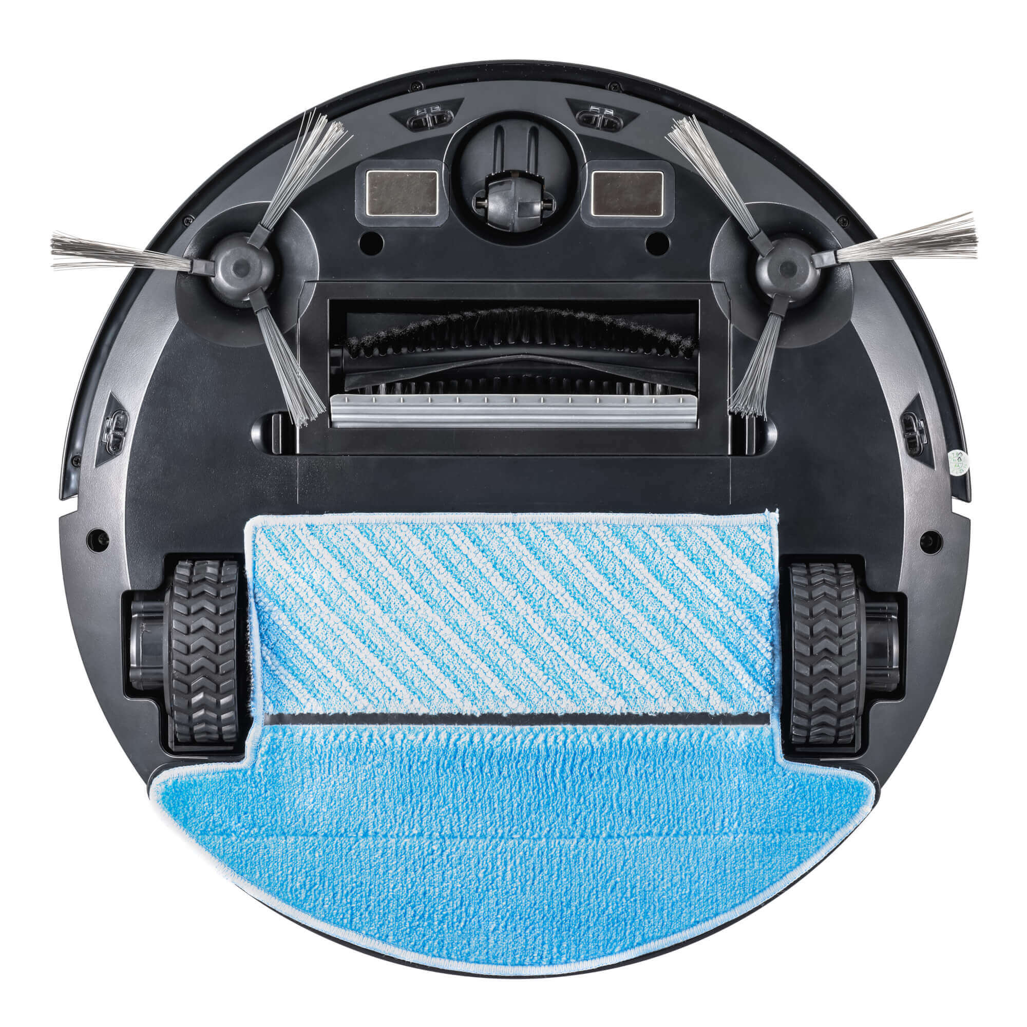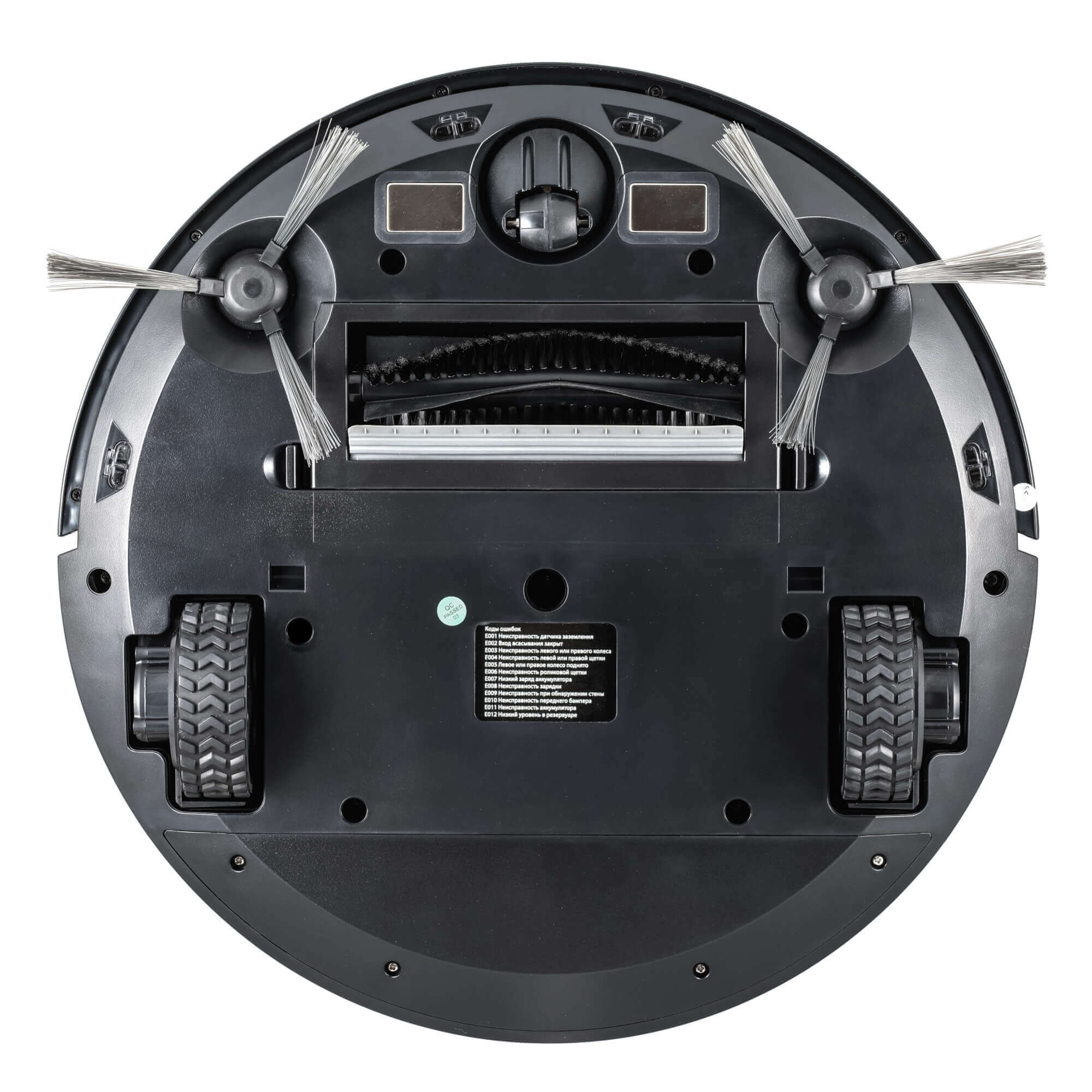 Siurbimo anga yra apatinio skydelio centre. Čia taip pat yra valymo blokas, kurį sudaro turbo šepetys ir šlavimo svirtis. Apatinio skydelio viršuje yra angos šoniniams šepečiams, taip pat jutiklių sistema, atsakinga už atstumo iki kliūčių nustatymą. Roboto dulkių siurblio akumuliatoriaus dangtelis taip pat yra skydelio apačioje.