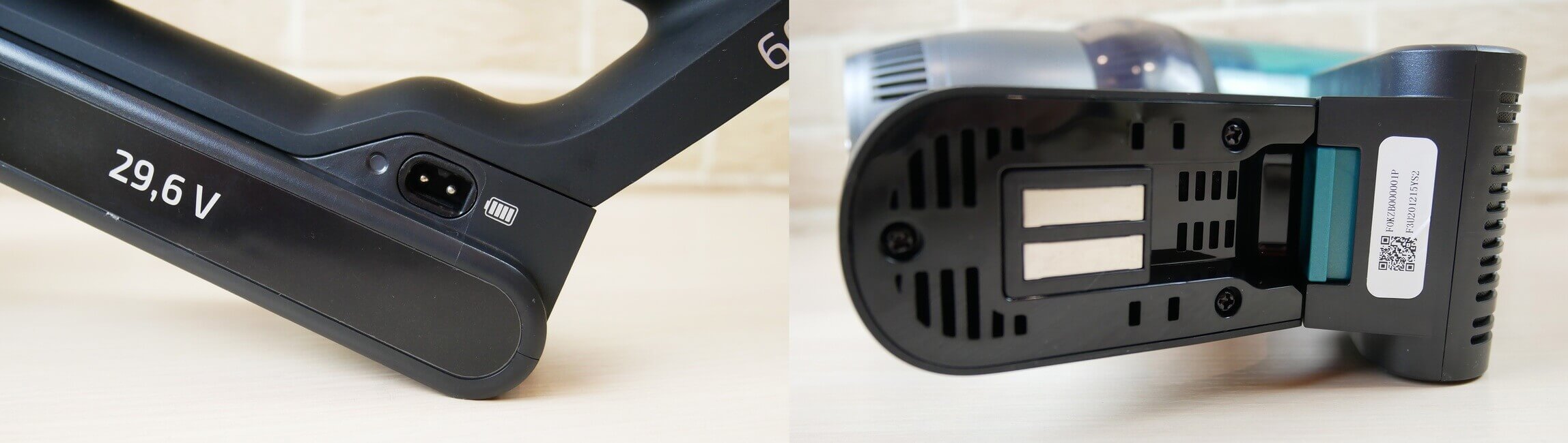 Dulkių siurblio įkrovimo gnybtai yra korpuso apačioje, todėl jį galima įkrauti naudojant prie sienos tvirtinamą laikiklį. Tai dar vienas privalumas. Tai panaikina poreikį rankiniu būdu prijungti kištuką, nors tokia galimybė yra.