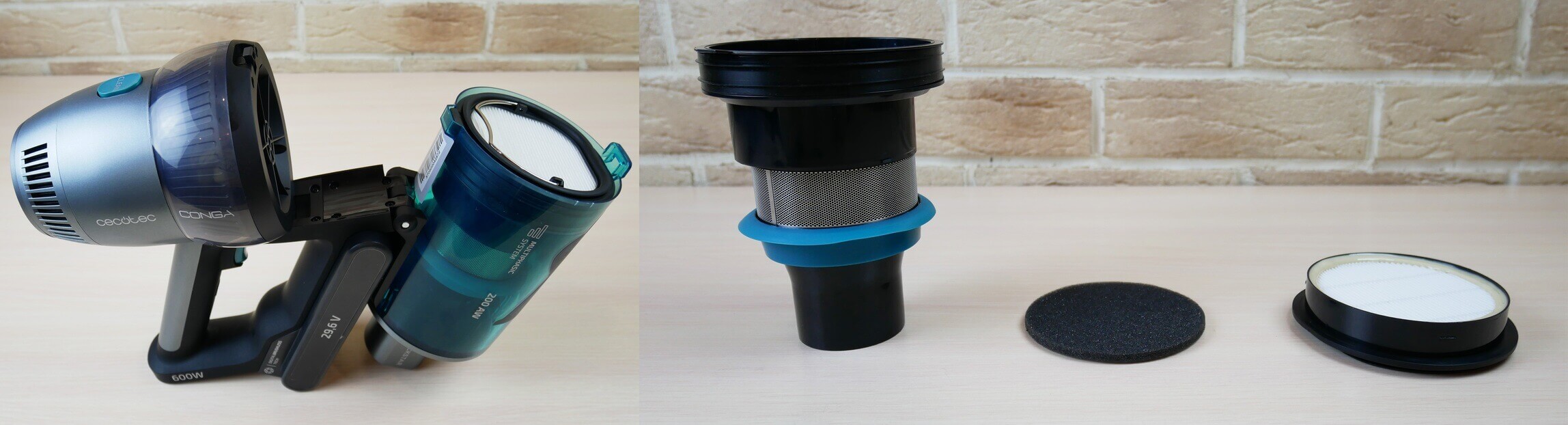 Dulkių surinktuvas atidaromas paspaudus mygtuką ant korpuso. Jame yra HEPA filtravimo sistema, putplasčio, tinklelio ir cikloniniai filtrai. Be to, surinktuvas atidaromas iš apačios, kad būtų lengva ištuštinti. Konteineryje telpa iki 600 ml sausų atliekų.