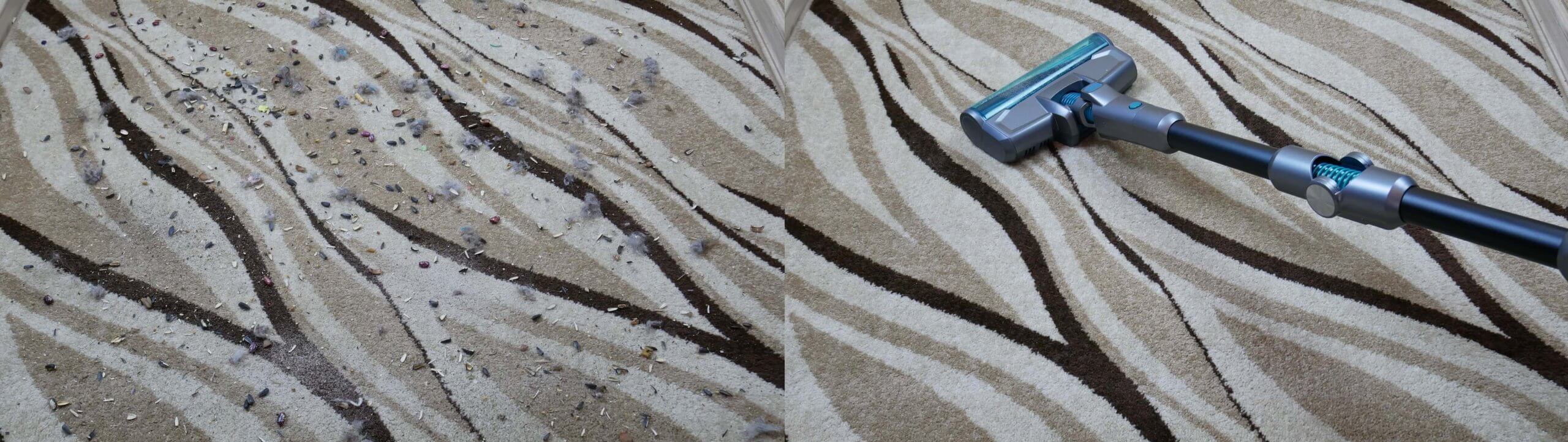 Tos pačios šiukšlės buvo išbarstytos ant kilimo, kur dar pabarsčiau smėlio. Kilimų šepečiu 900 modelis gerai valo kilimą net ir esant vidutiniam galingumui. Maksimaliu galingumu dulkių siurblys labai giliai valo kilimą. Ir vėlgi, šepetys po valymo būna švarus, o visos šiukšlės sandariai suspaudžiamos į dulkių konteinerį.