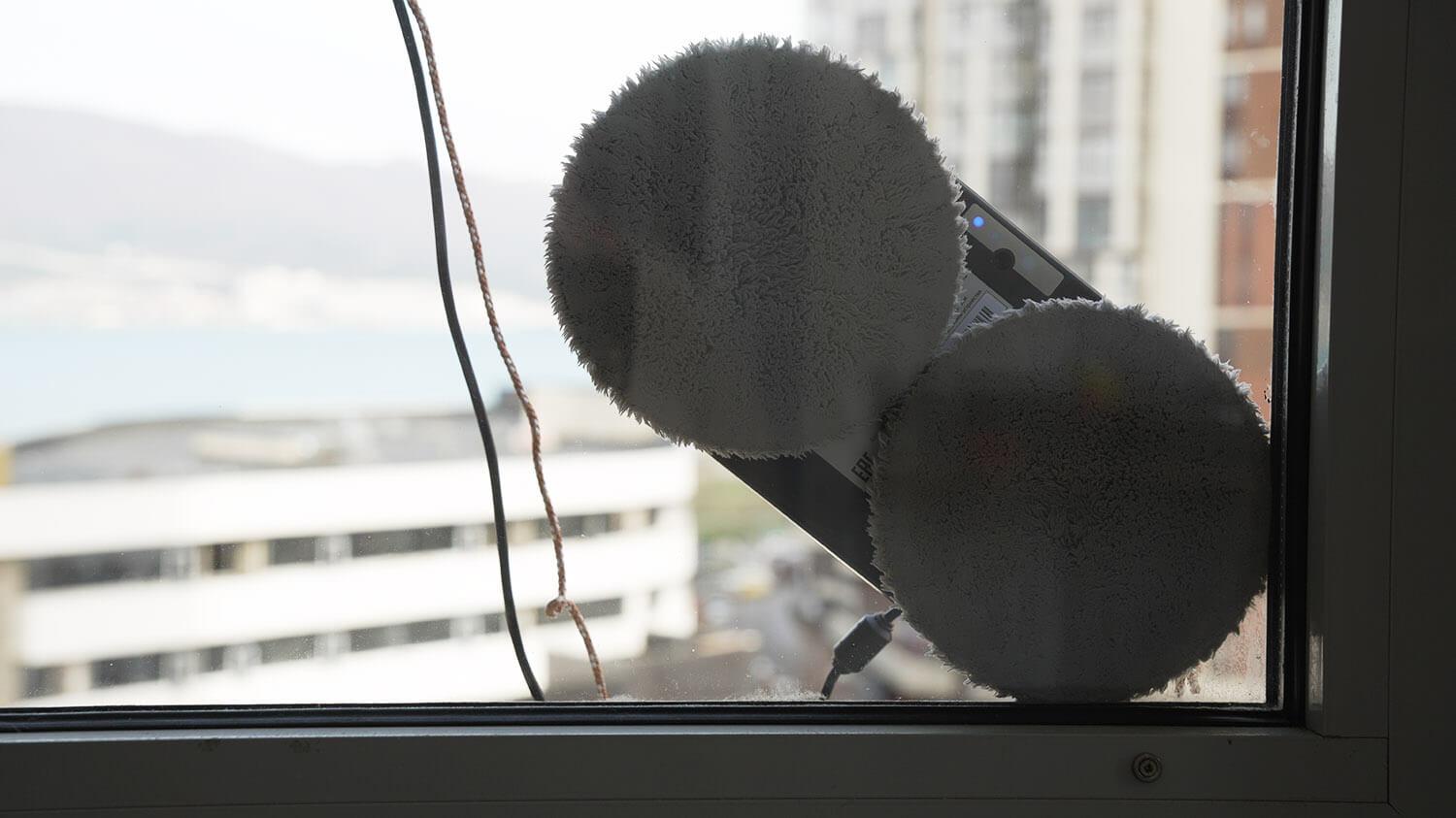 Galiausiai pereikime prie bandymų. Pirmiausia patikrinsime, kaip W120 atlieka savo pagrindinę užduotį – langų valymą iš išorės. Taip pat galėsime įvertinti jo navigaciją. Pirmojo roboto perėjimo per langus metu surenkami visi nešvarumai. Rekomenduojama nešvarinti servetėlių, kad sumažėtų rizika ištepti stiklą nešvarumais. Antrojo perėjimo metu galite ant servetėlių papurkšti šiek tiek vandens arba valymo skysčio.