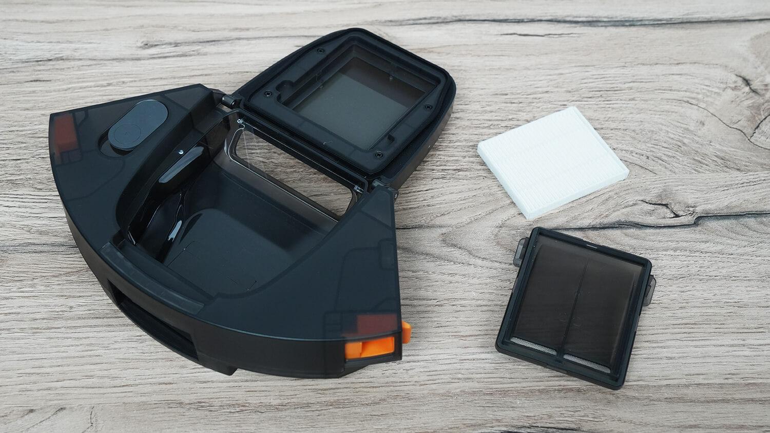 Kalbant apie stotelę, robotas dulkių siurblys įkrauna ir ištuština dulkių konteinerį ant jos. Man patiko kompaktiškas stotelės dydis, apie kurį papasakosiu vėliau. Dulkių maišelis yra po viršutiniu dangčiu ir yra kompaktiškesnis nei dauguma kitų robotų. Jame telpa iki 3 litrų sausų atliekų.
