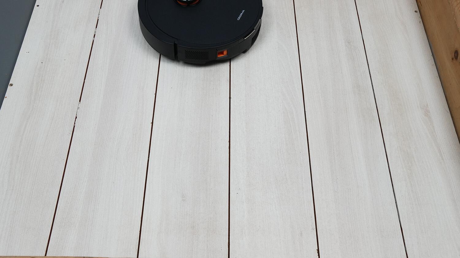 Laminuotų grindų šiukšlių surinkimo kokybė gera. Nuo stovo buvo surinktos įvairios tekstūros šiukšlės. Liko nešluoti tik kampai – tai silpnoji daugumos apvalių robotų vieta.