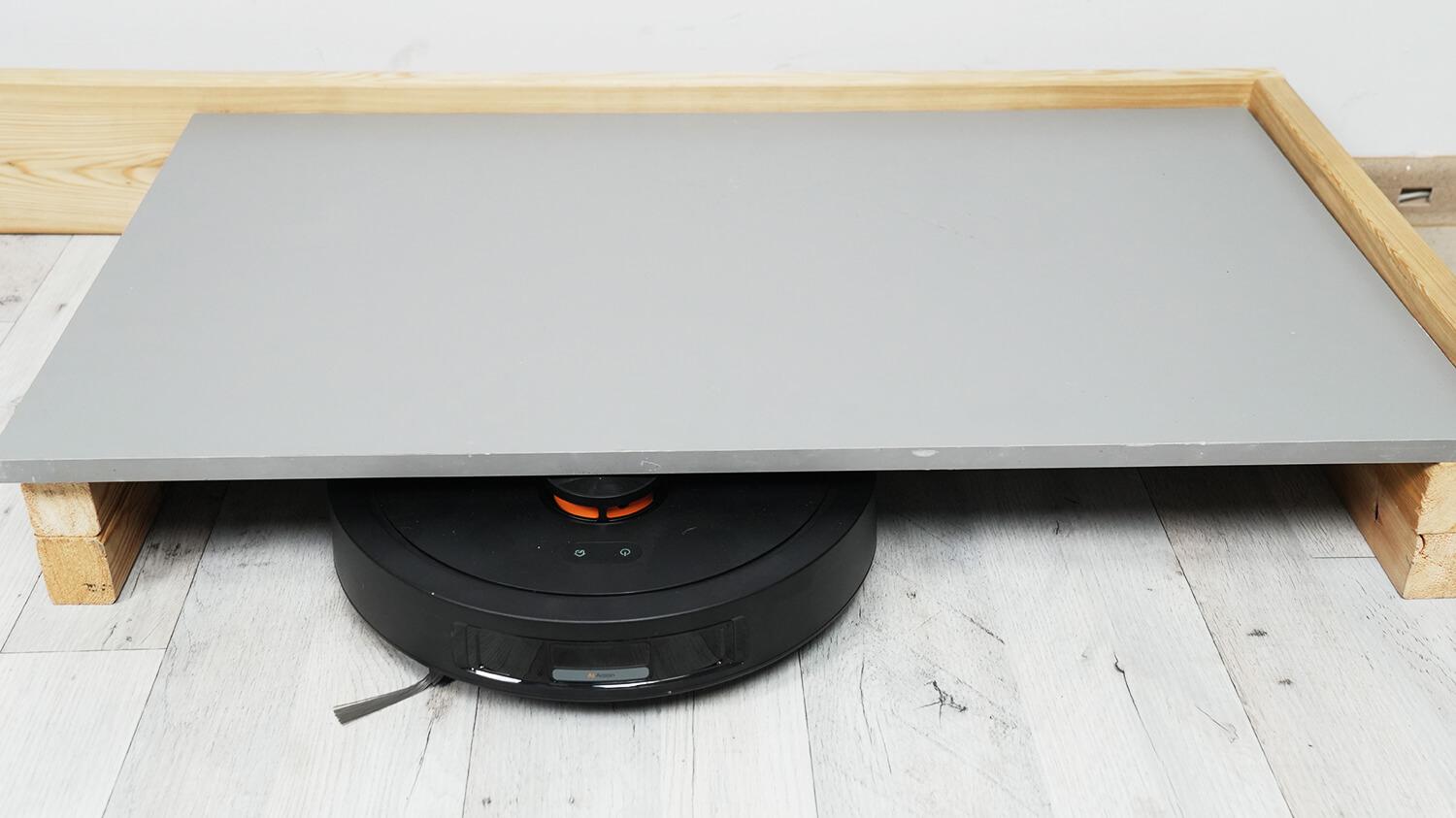 Taip pat išbandžiau, ar robotas gali tilpti po standartiniu 10 cm tarpu po baldais. Taip, jis tai gali padaryti be jokių problemų. Testas buvo sėkmingas.