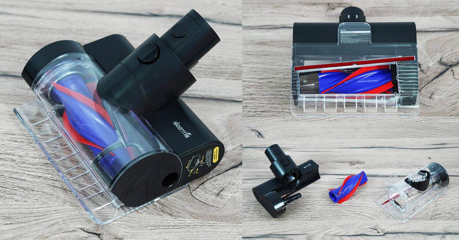 Baldų apmušalų valymo antgalis yra įdomios konstrukcijos. Volelis yra šiek tiek sutrumpintas, tikriausiai tam, kad būtų lengviau pašalinti susivėlusius plaukus. Silikoninės mentelės lengvai pašalina šiukšles jų nesiveldamos. Šis antgalis taip pat lengvai išardomas be jokių įrankių.