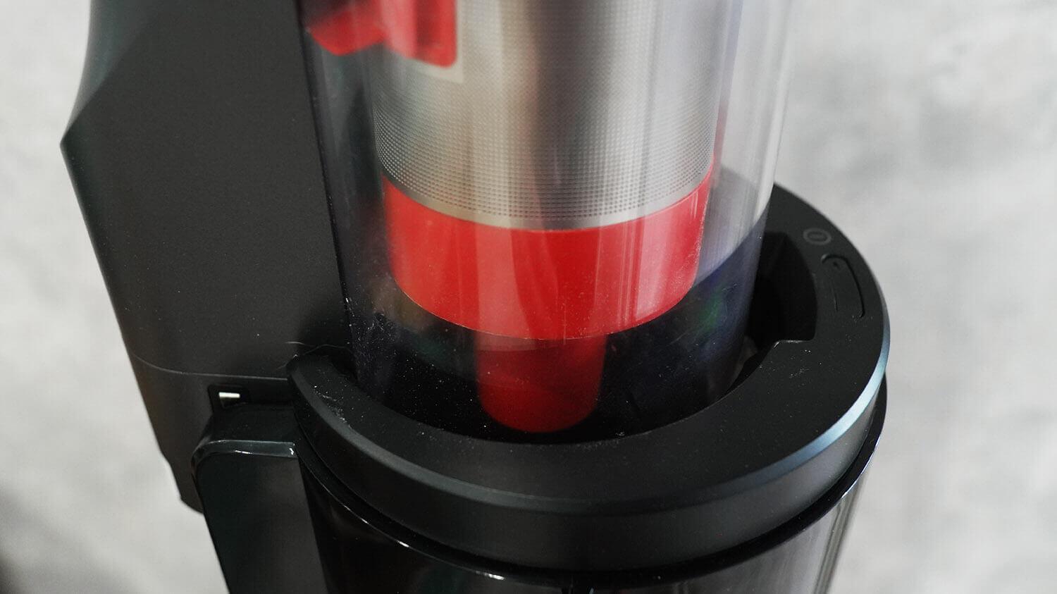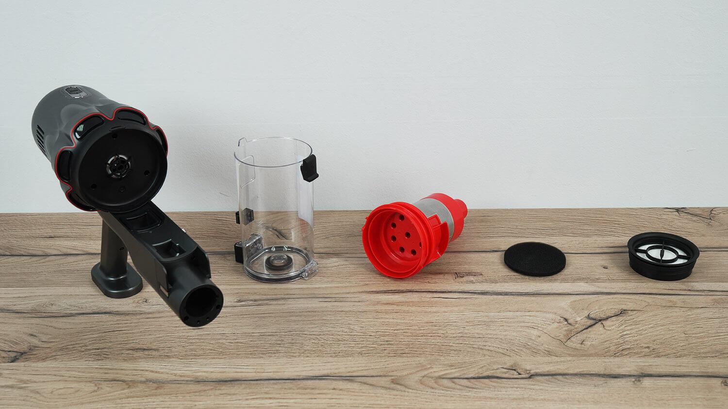 Prireikus kolbą galima nuimti nuo pagrindinio įrenginio. Joje yra filtravimo sistema, kurią sudaro HEPA filtras, putplastis, ciklonas ir tinklelis. Beje, šio modelio baterijos negalima išimti, į ką taip pat svarbu atsižvelgti.