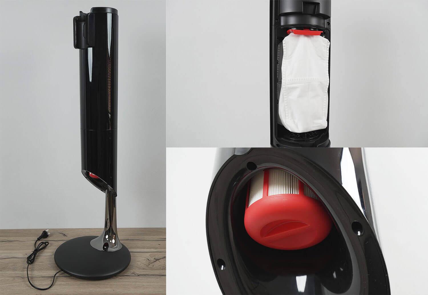 Kalbant apie stotelę, man asmeniškai nelabai patiko lengvai sutepama blizgi apdaila. Tai, galima sakyti, įprastas dalykas. Pats dizainas man pažįstamas. Savaiminis valymas įjungiamas rankiniu būdu paspaudus mygtuką viršuje. Už dangtelio paslėptas 1,8 litro talpos maišelis. Tai standartinis dizainas. Po maišeliu įmontuotas medžiaginis filtras, bet man patiko HEPA pūtimo filtras, įmontuotas stotelės apačioje. Tai įvertins alergiški žmonės! Ne visos stotelės turi tokią filtravimo sistemą.