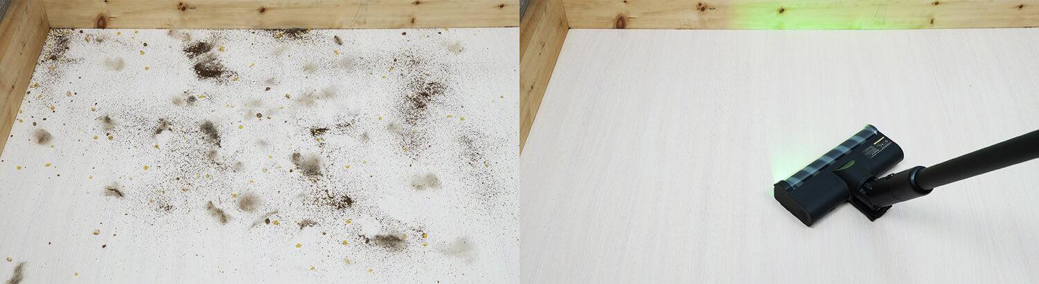 Dabar patikrinkime, kaip gerai „Deerma DEM-T30W“ stotelė surenka grindų šiukšles. Ant laminuotų grindų išbarsčiau įvairių rūšių šiukšles: plaukus, kailį, grūdus ir kitas smulkias buitines šiukšles. Ši mašina gerai susidorojo su užduotimi. Svarbu pažymėti, kad ji be vargo surenka šiukšles palei grindjuostes ir kampuose. Ji kruopščiai surenka viską. Volelyje neįstringa plaukai ar pūkeliai. Testas išlaikytas!
