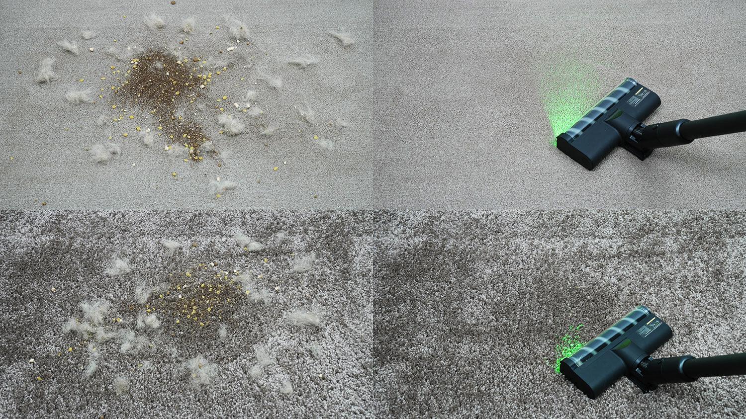 Tos pačios šiukšlės buvo išbarstytos ant trumpo plauko kilimo, ir net su kietoms grindims skirtu voleliu dulkių siurblys galėjo kruopščiai išvalyti kilimą, nepalikdamas jokių šiukšlių. Tačiau vidutinio plauko kilimuose volelis nėra toks efektyvus. Nors jis vis dar gali surinkti šiukšles nuo paviršiaus, jis nepašalina įsisenėjusių dalelių iš krūvos. Svarbu į tai atsižvelgti.