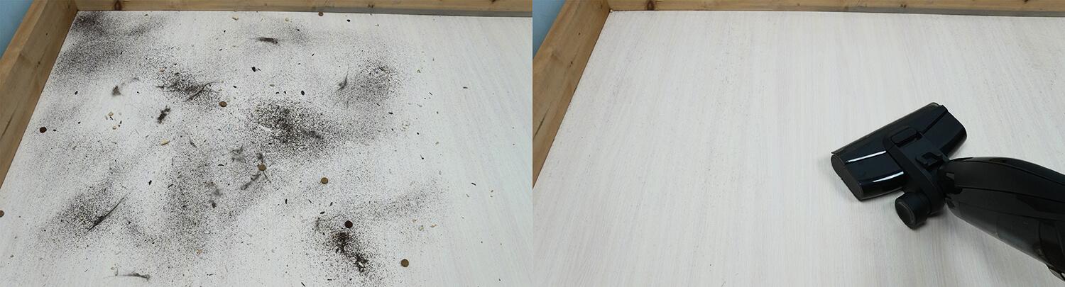 Šlapio/sauso valymo dulkių siurblys taip pat gali būti naudojamas dulkėms surinkti. Jis lengvai surenka nuo grindų įvairių tekstūrų šiukšles. Didesnėms dalelėms surinkti reikia kelių bandymų, bet jam tai pavyksta. Beveik visos šiukšlės surenkamos nuo stovo. Kampe yra minimali akloji zona, bet ji iš tikrųjų yra nereikšminga.