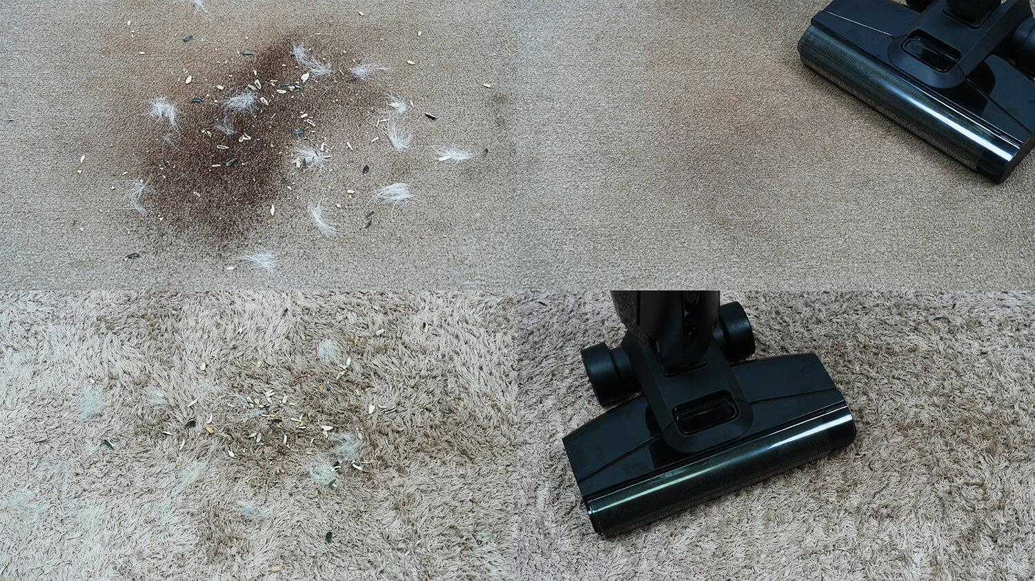 „Deerma VX100 Ultra“ netinka naudoti ant pūkuotų kilimų dėl savo volelio struktūros. Nors jis vis dar gali surinkti šiukšles nuo paviršiaus, jis jų neištraukia iš krūvos kaip tradiciniai vertikalūs sauso valymo dulkių siurbliai, kaip parodė mūsų bandymai.