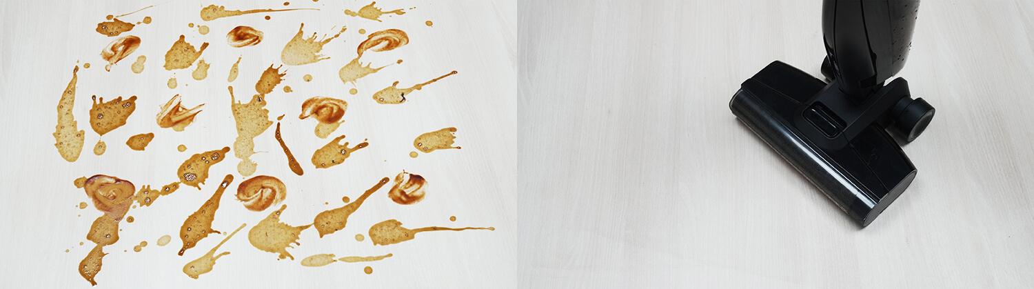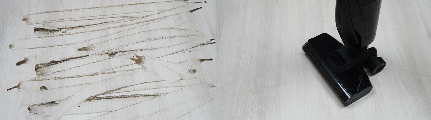 Prietaisu taip pat galima valyti grindis. Matome, kad neliko jokių žymių ar dryžių. Grindys yra idealiai švarios.