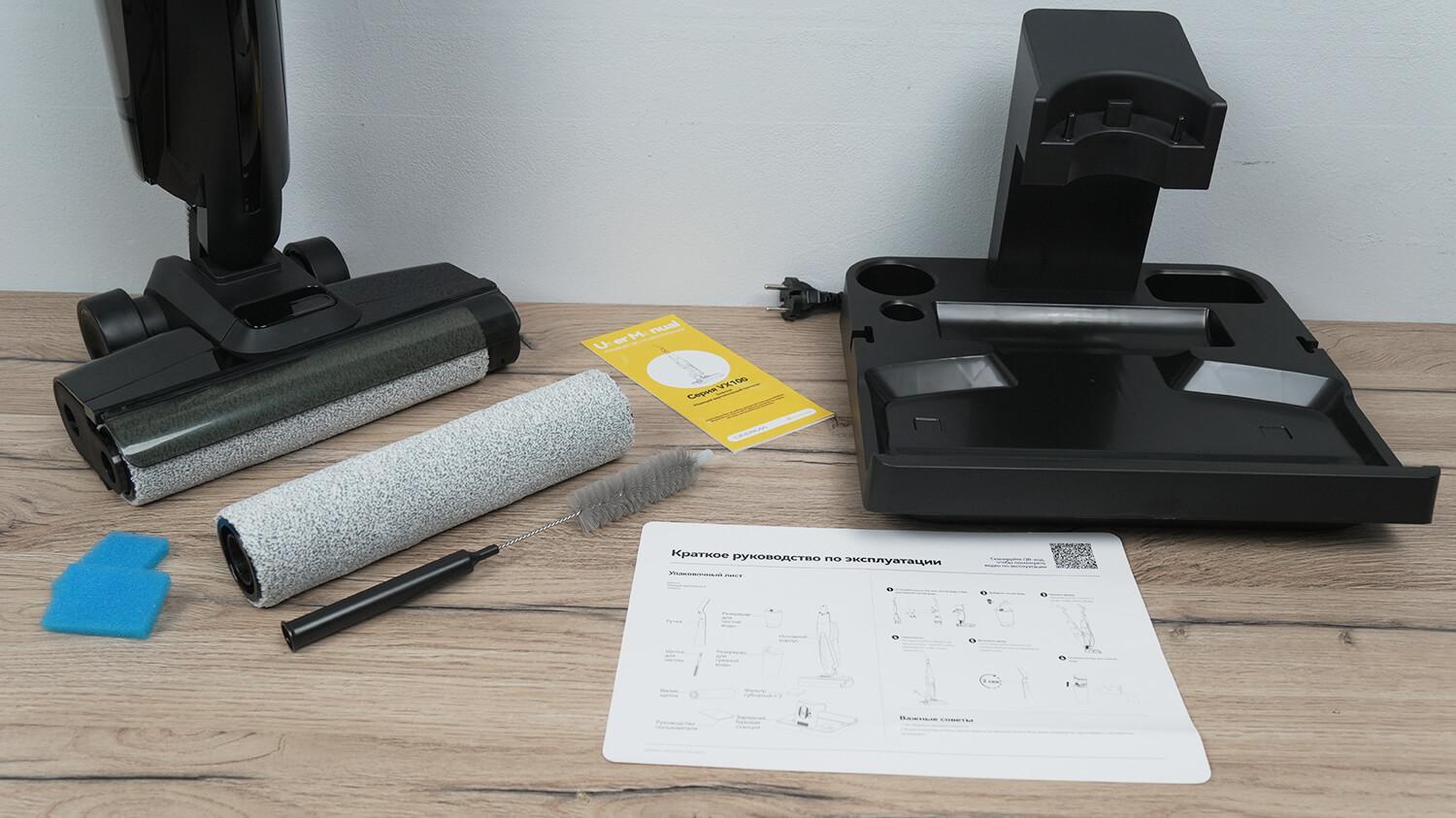 Be paties dulkių siurblio ir pagrindo, pakuotėje yra atsarginis volelis, du atsarginiai kempinės filtrai, valymo įrankis, greito paleidimo vadovas ir instrukcijos rusų kalba.