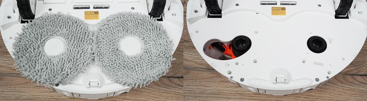 Už vieno iš laikiklių matome mechanizmą, kuris ištiesia valymo šluostę iki krašto, kad būtų galima kruopščiai išvalyti grindis palei grindjuostes ir kampus. Abi valymo šluostės automatiškai pakyla, kai patenka į kilimus, sauso valymo režimu ir kai robotas grįžta į stotį.