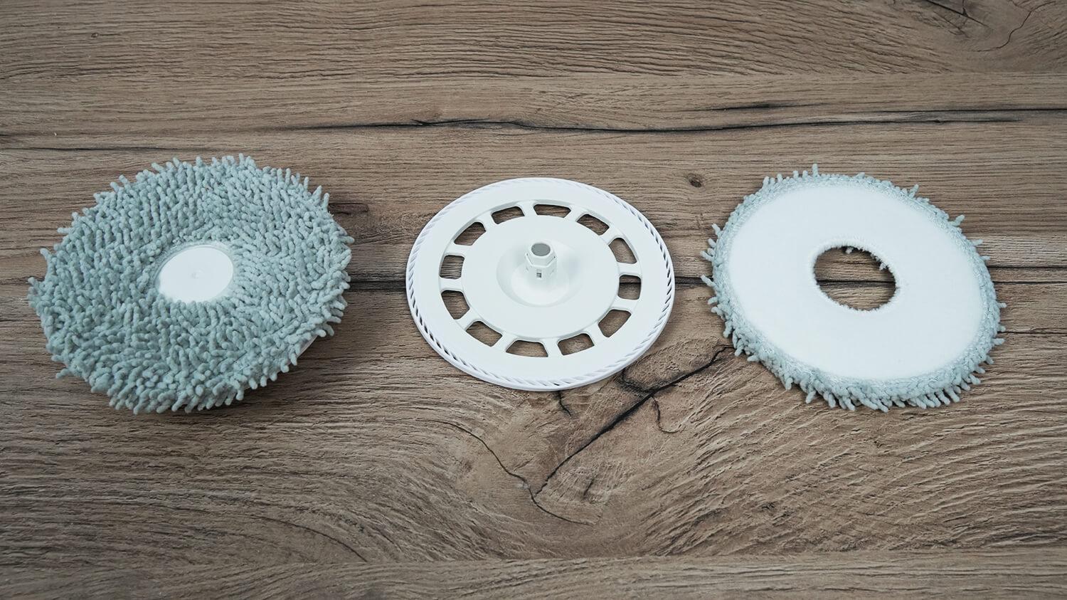 Grindys valomos dviem apvaliomis, besisukančiomis šluostėmis, pritvirtintomis prie laikiklių lipdukais. Šluostės yra labai storos ir geros kokybės.