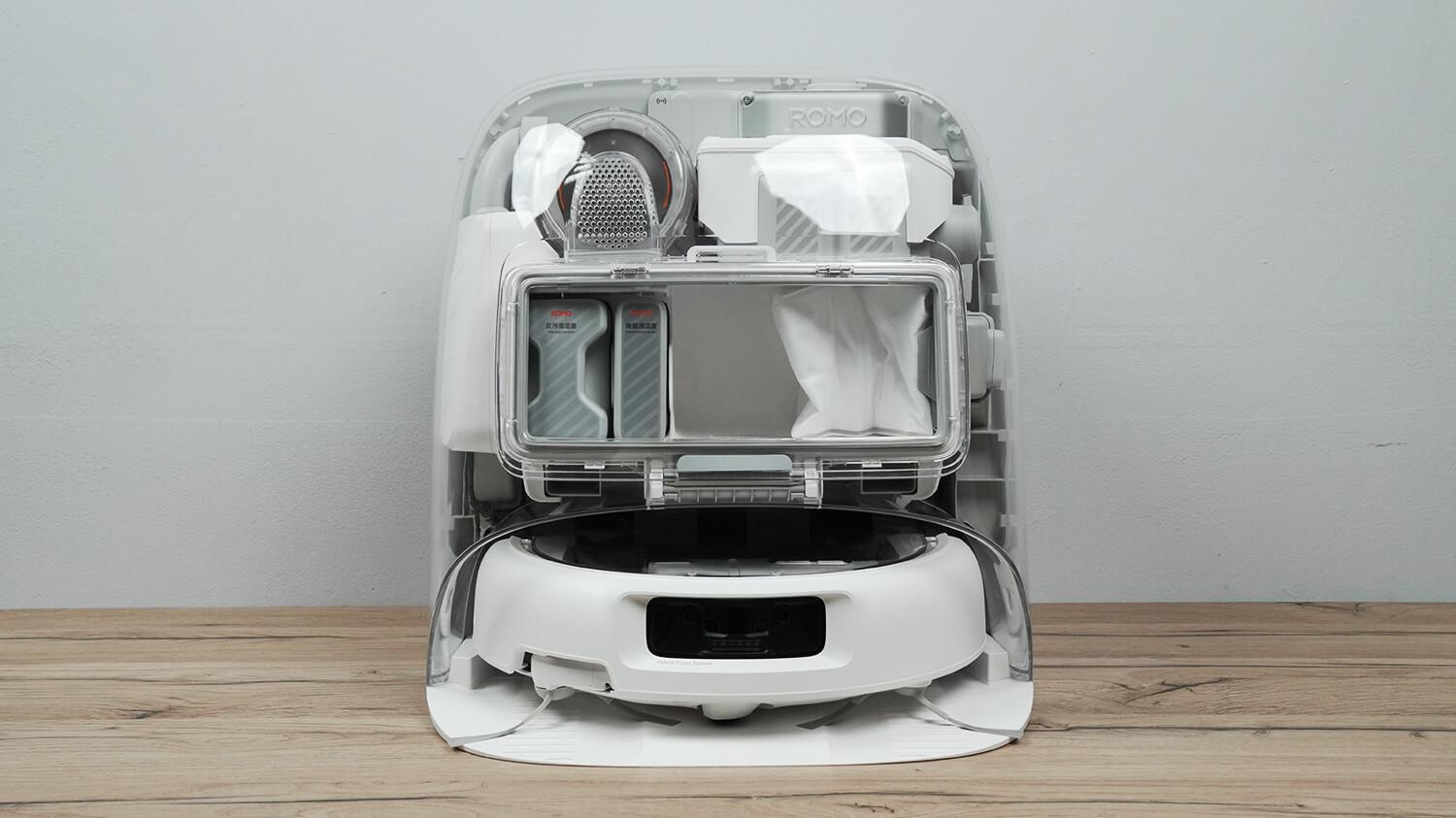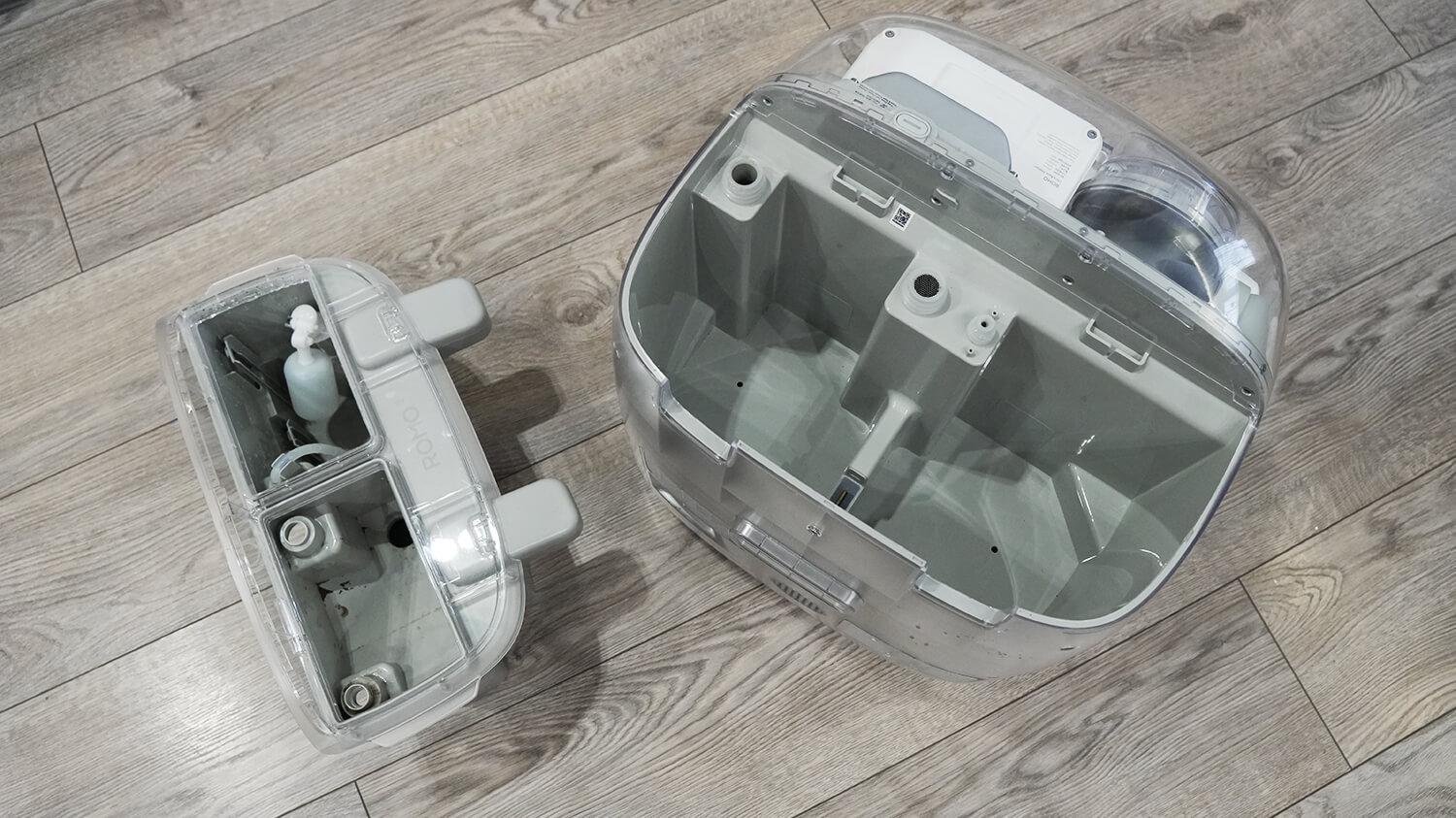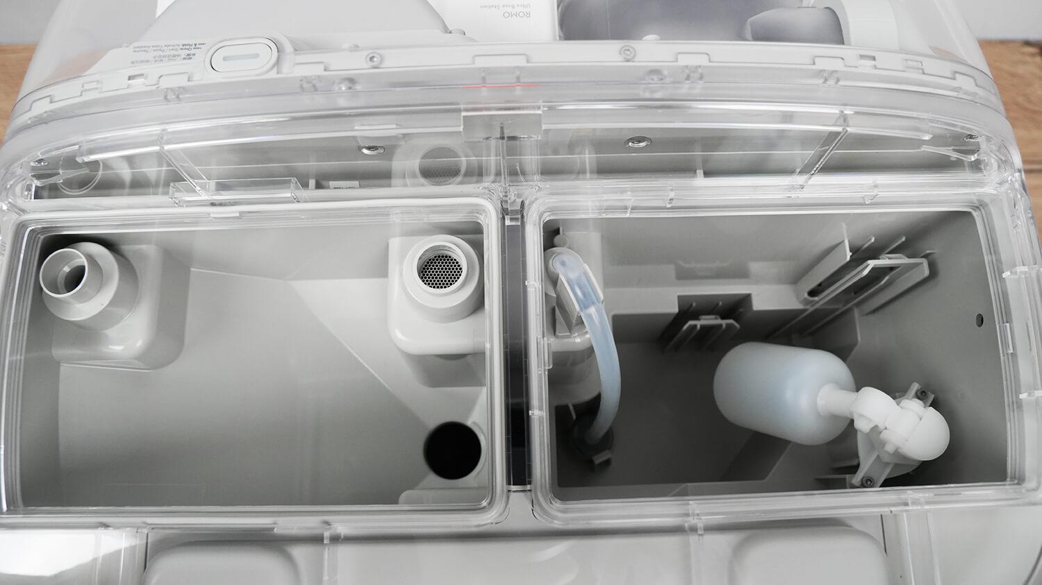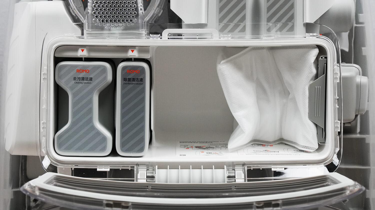 Atliekų maišas ir du ploviklio rezervuarai yra po dangčiu virš roboto stovėjimo aikštelės. Standartiniame 2,4 litro atliekų maiše telpa 400 ml įprasto ploviklio, kuris automatiškai sumaišomas su švariu vandeniu plaunant servetėles. Taip pat yra atskiras 200 ml dezinfekavimo priemonės rezervuaras. Kurį ploviklį naudoti, galite pasirinkti nustatymuose.