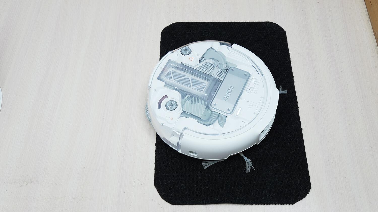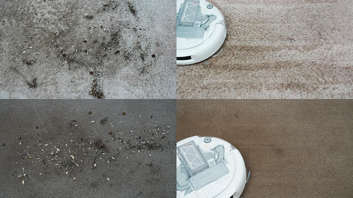 Išbandžiau kilimų valymo efektyvumą. Galiu pasakyti, kad „DJI ROMO P“ kruopščiai išvalė trumpo plauko kilimus. Jis taip pat kruopščiai išvalė vidutinio plauko kilimus. Tačiau silikoninis šepetėlis vis tiek sunkiai surenka dideles šiukšles. Šiuo atžvilgiu geriau veikia šerelių-žiedlapių šepetėlis.