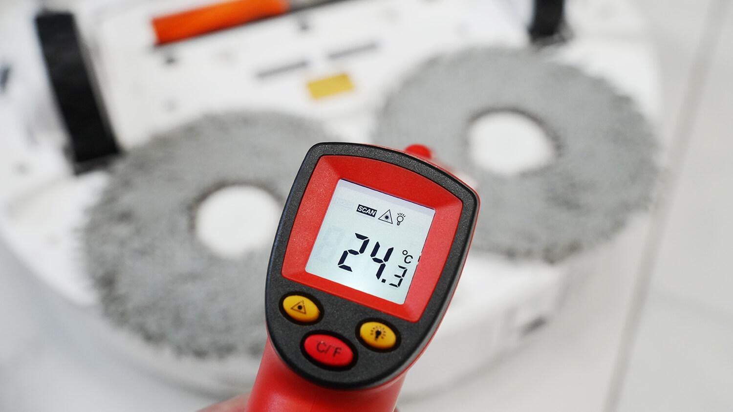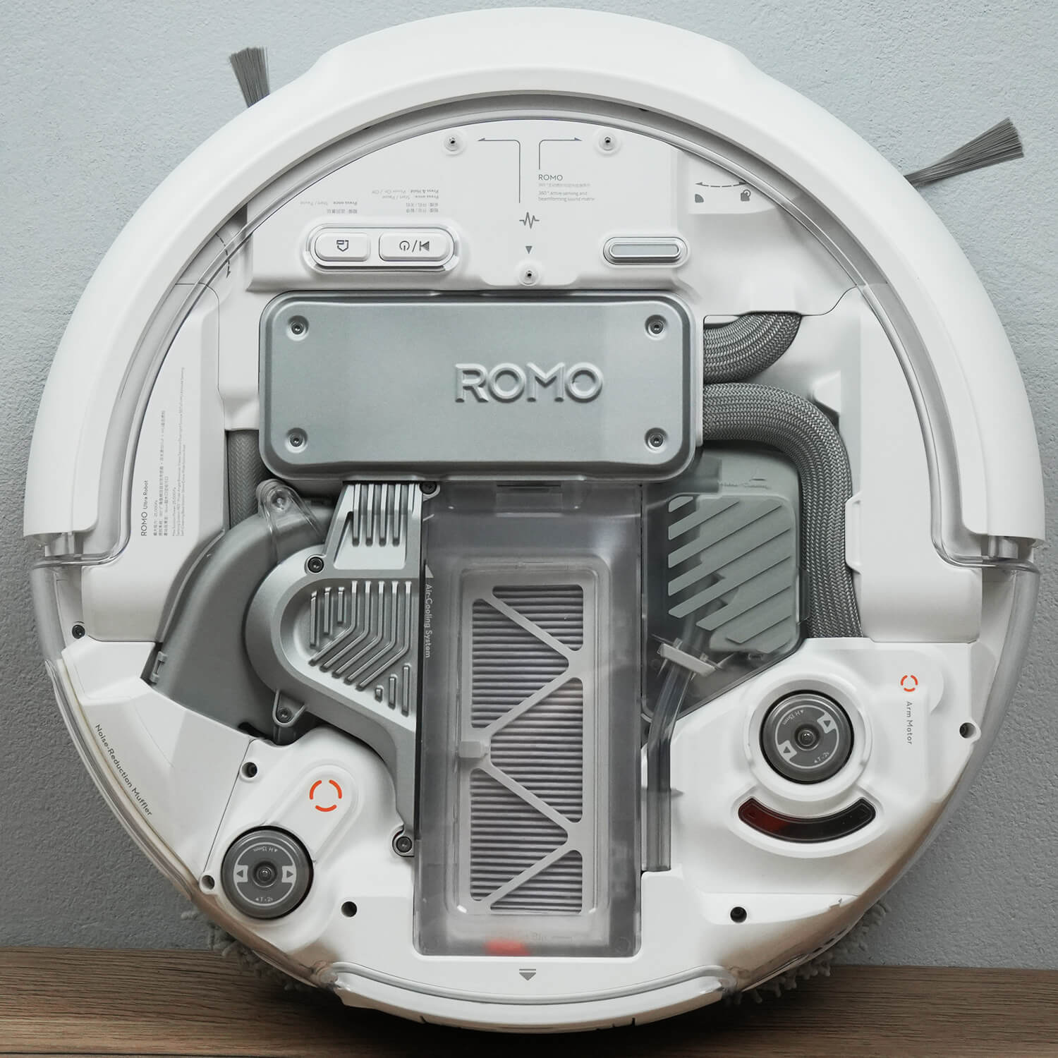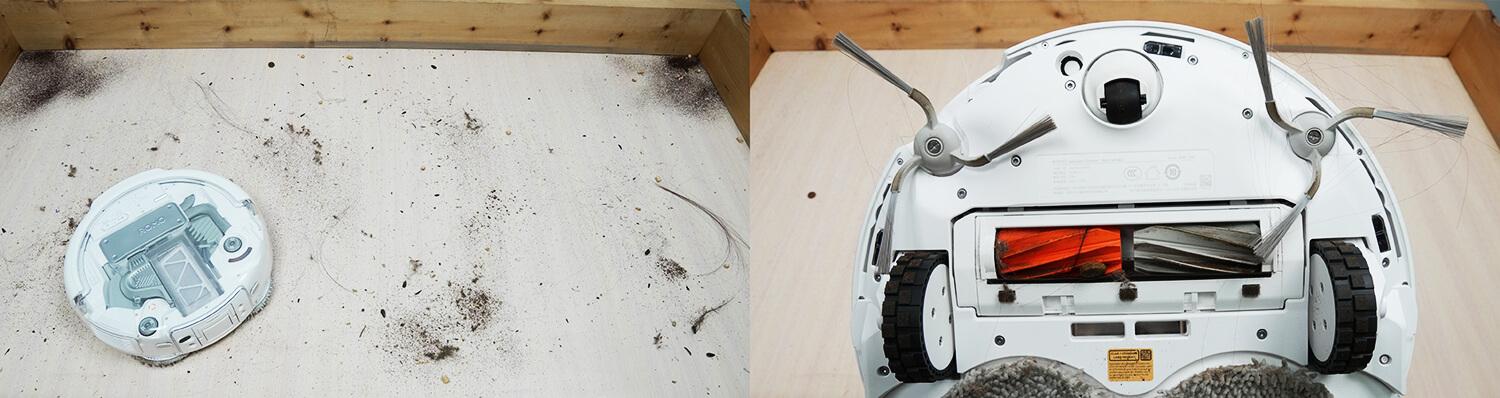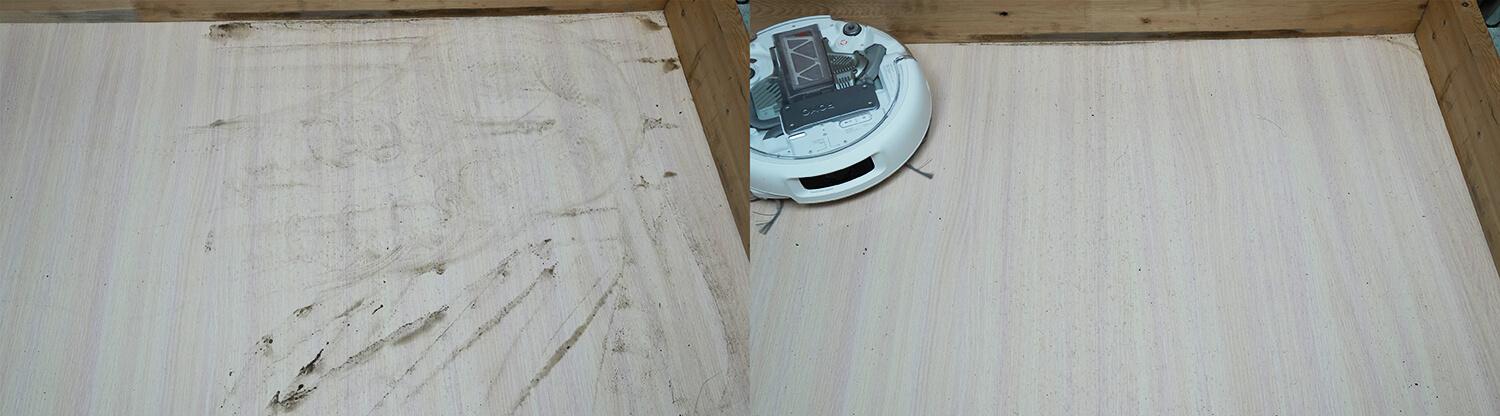 Valymo efektyvumas taip pat puikus. Šluostė tvirtai prispaudžia grindis ir sugeria nešvarumus. Robotas taip pat kruopščiau valo valymo zonos kraštus, nes viena iš šluosčių siekia grindjuostę.