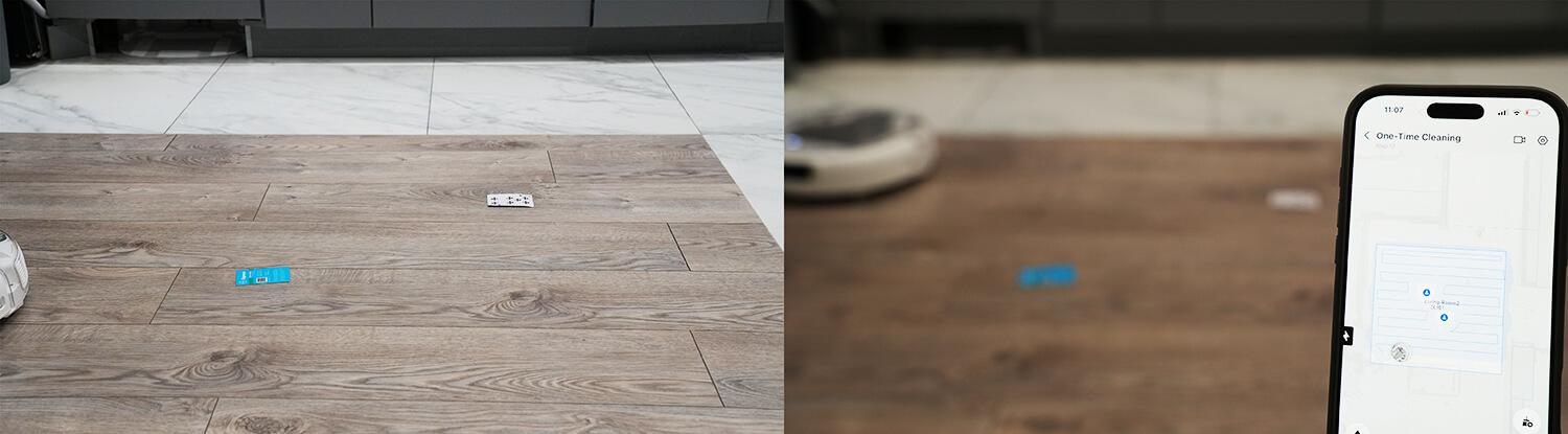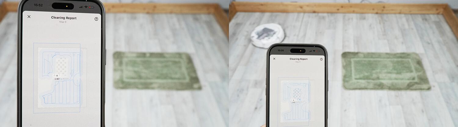 Kalbant apie navigaciją namo viduje, robotas dulkių siurbliu valė kambarį po kambario gyvatės būdu, o tada palei perimetrą. Kartkartėmis jis sustodavo valymo stotelėje, kad išplautų servetėles, o tada tęsdavo valymą nuo ten, kur baigė. Neliko jokių neišvalytų vietų – testas išlaikytas!
