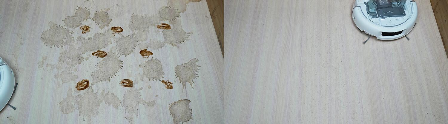 Šveičiant sunkiai įveikiamas dėmes, robotas sugebėjo pašalinti net pridžiūvusias kavos ir padažo dėmes. Įdomiausia, kad daugumai dėmių pašalinti prireikė vos keturių perėjimų, o vos penkiais perėjimais jis visiškai pašalino minimalius padažo likučius ant stovo, o penki–šeši perėjimai laikomi puikiais.