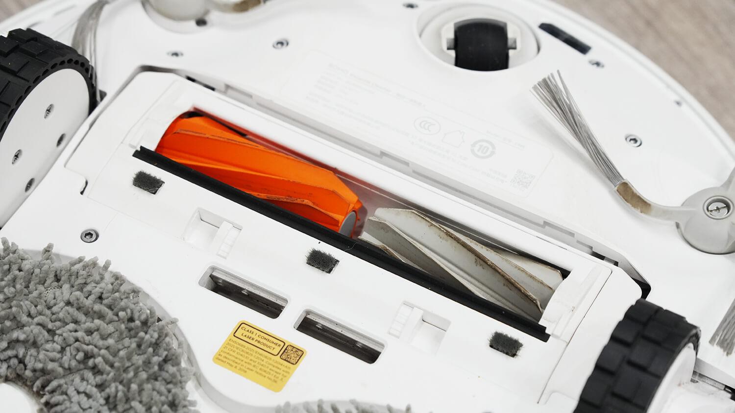Patikrinkite valymo modulio būklę. Matote, kad centrinis šepetys yra šiek tiek susivėlęs, kaip ir šoniniai šepečiai. Tačiau tai nėra kritiška, atsižvelgiant į šiukšlių kiekį ant stovo. Reikia atlikti tolesnius bandymus!