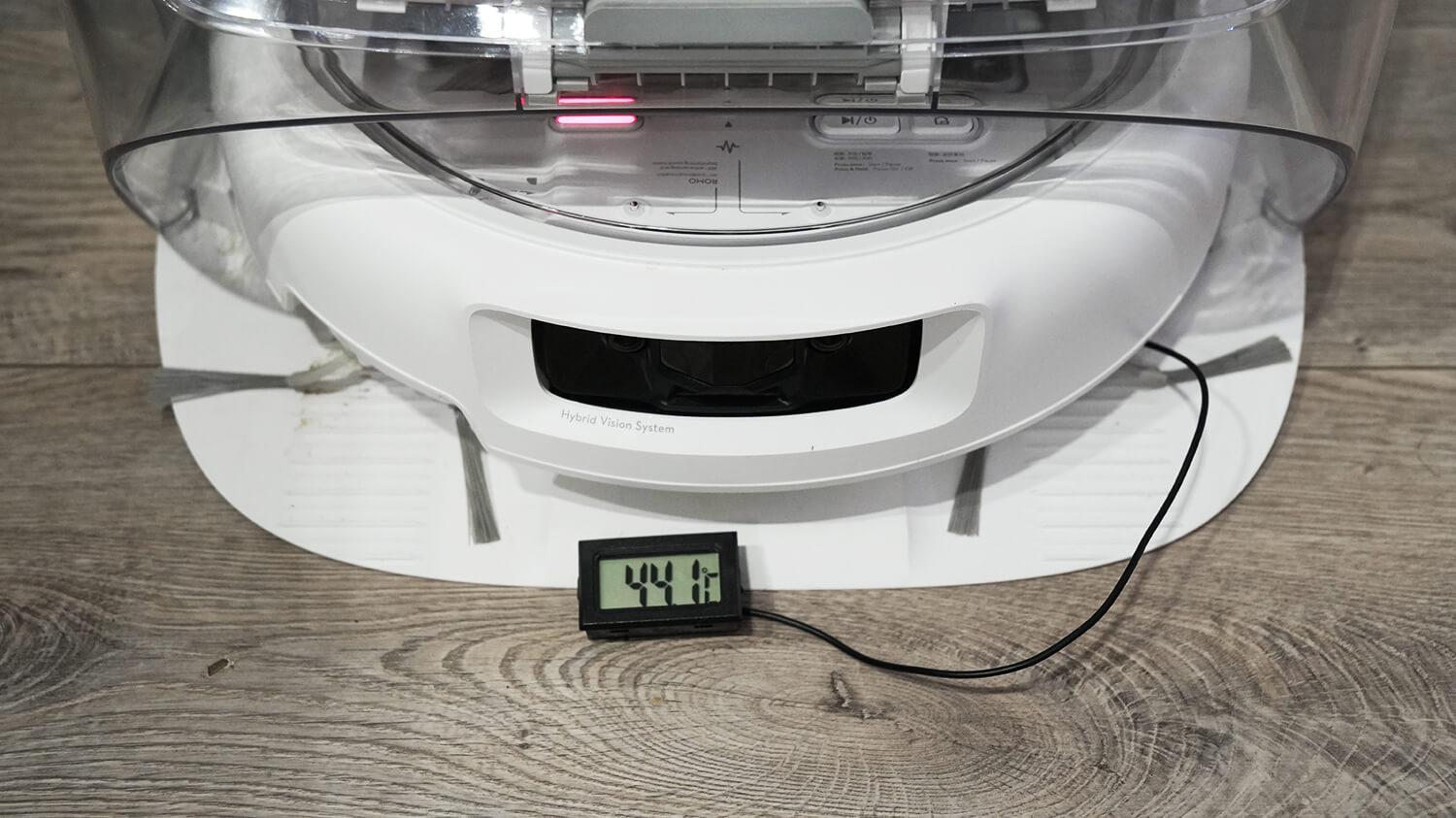 Taip pat išbandžiau baterijos veikimo laiką, kai robotas veikė maksimaliu galingumu ir įjungė šlapio valymo režimą. Jis veikė 224 minutes, išvalydamas 106 kvadratinius metrus naudingo ploto. Roboto baterijos veikimo laikas yra toks pat kaip ir aukščiausios klasės robotų, tačiau yra vienas trūkumas. Paskutinį kartą jį paleidau maksimaliu galingumu, bet sauso valymo režimu, kad pademonstruočiau svarbų dalyką.