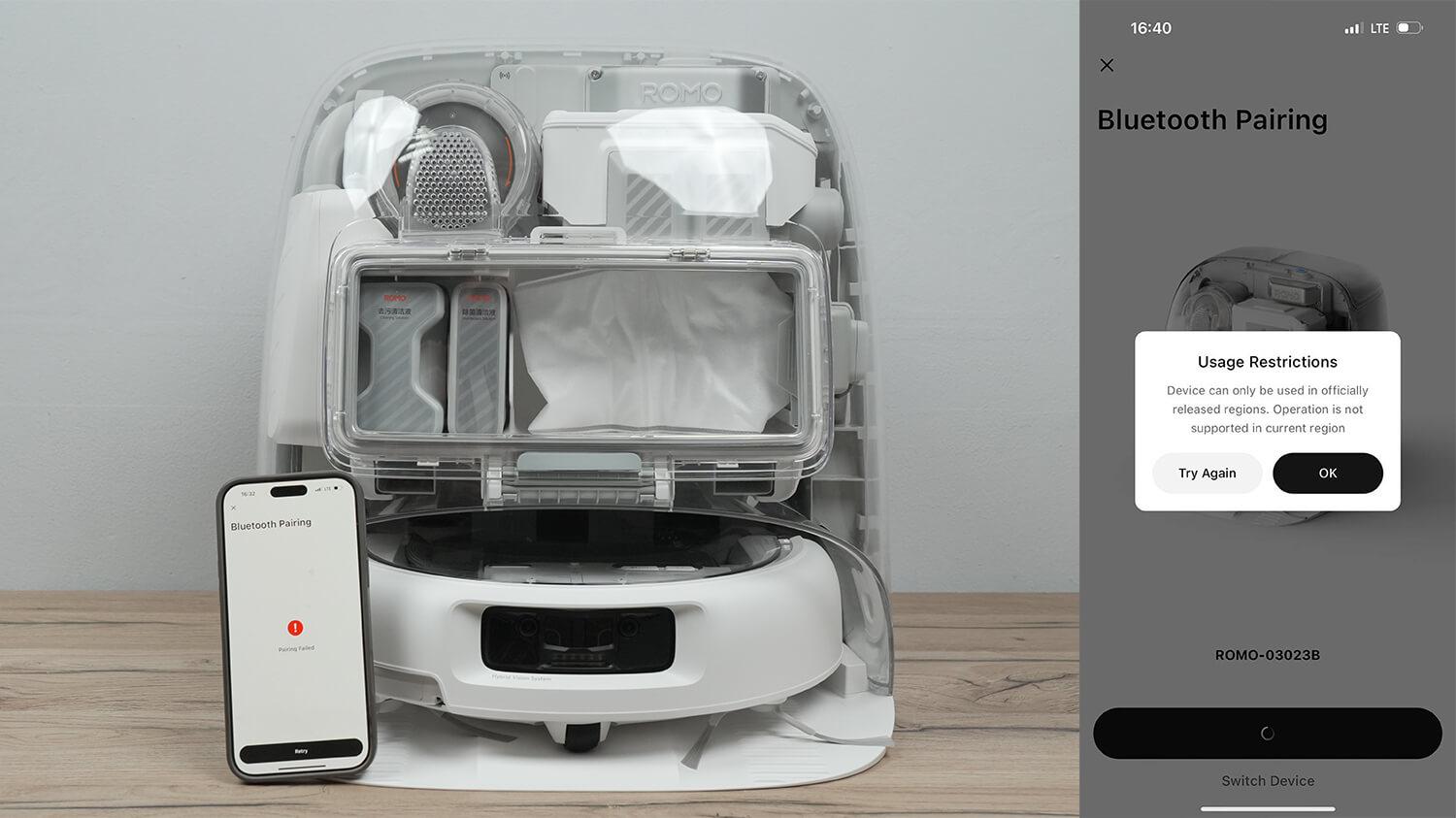 Pradėkime nuo labiausiai erzinančios dalies. Rašymo metu „DJI ROMO P“ yra Kinijos rinkai skirta versija. Už Kinijos ribų, prisijungus prie programėlės, pasirodo pranešimas, kad modelio regionas nesuderinamas. Roboto prijungti prie tinklo ar pasiekti meniu neįmanoma. Yra būdų, kaip apeiti regioninį užraktą, tačiau jų atskleidimas draudžiamas įstatymų, todėl rekomenduojama pasikonsultuoti su forumais, kaip ir aš padariau. Ypatinga padėka Artemui Belikui už pagalbą prijungiant robotą.
