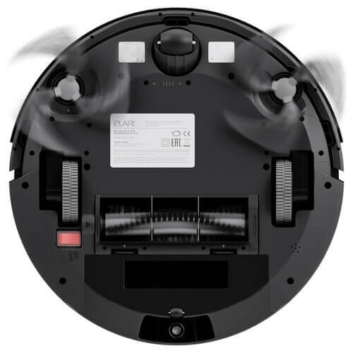 Roboto dulkių siurblio gale yra šoniniai varomieji ratai, universalus ratas, įkrovimo kontaktai, maitinimo jungiklis, įkrovimo gnybtai, akumuliatoriaus skyrius, aukščio jutikliai, šoniniai šepečiai ir pagrindinis šepetys arčiau centro.