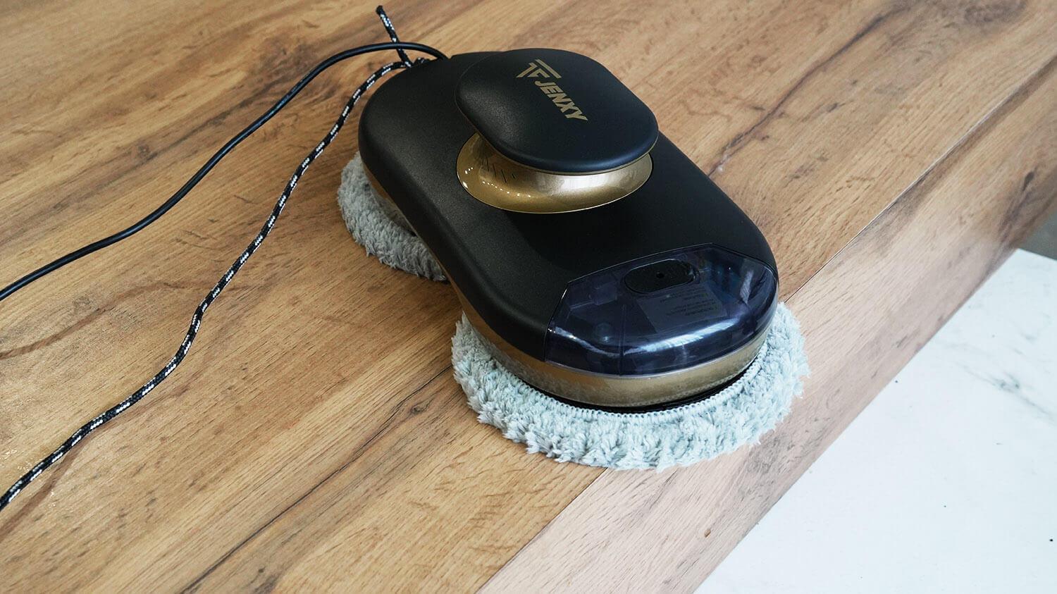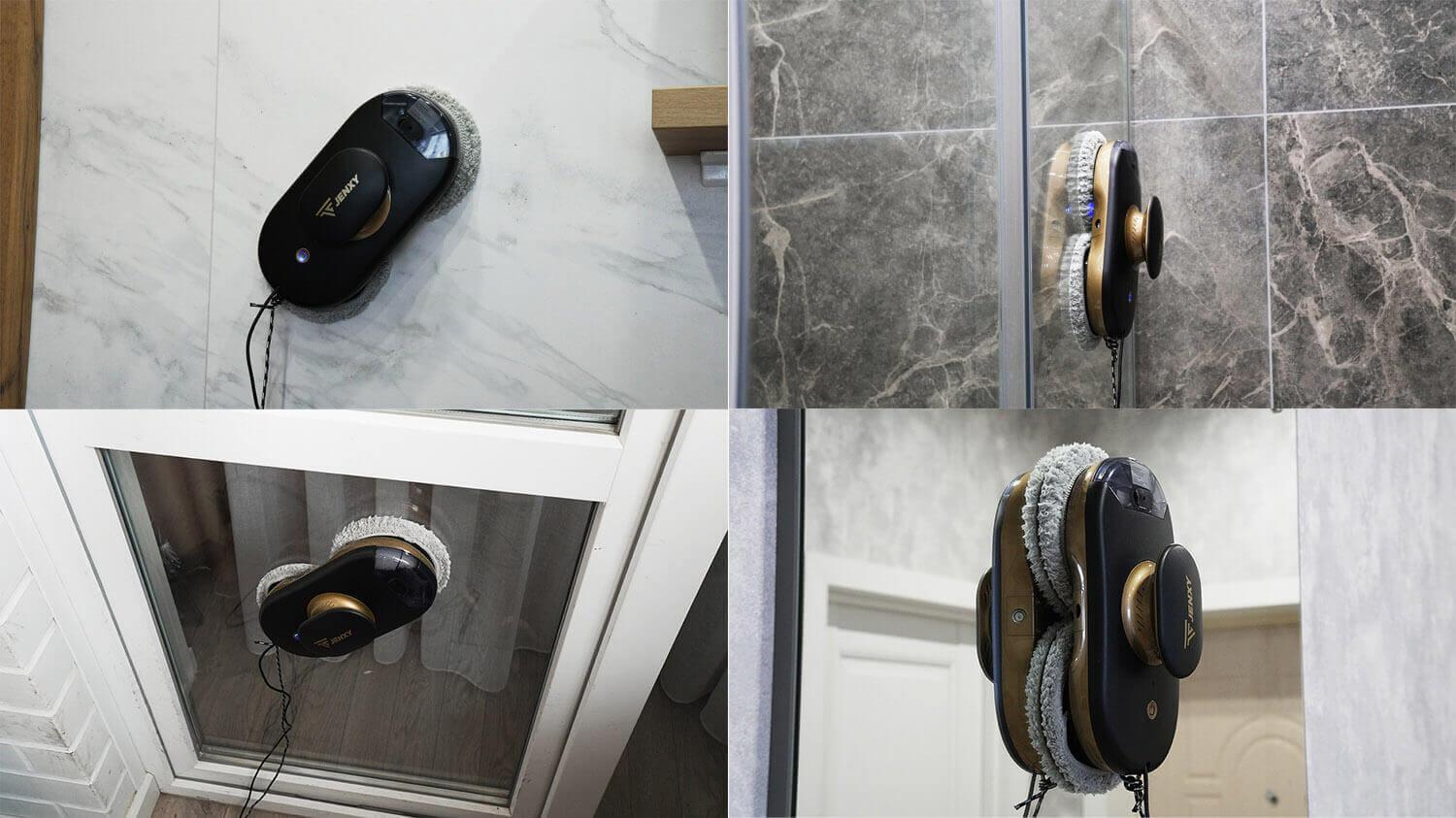 Šis robotas taip pat gali būti naudojamas plytelėmis išklotoms sienoms, dušo kabinoms ir veidrodžiams valyti. Svarbu paminėti, kad „JENXY RC78“ gali švelniai nuriedėti nuo berėmės dangos kraštų neprarasdamas sukibimo. Tai pliusas! Tačiau iš patirties galiu pasakyti, kad geriausia nenaudoti roboto su apvaliomis šluostėmis ant berėmės dangos paviršių, nes jose nėra specialių kampinių jutiklių, kaip kvadratiniuose robotuose, todėl padidėja rizika, kad robotas apvirs. Turėkite tai omenyje!