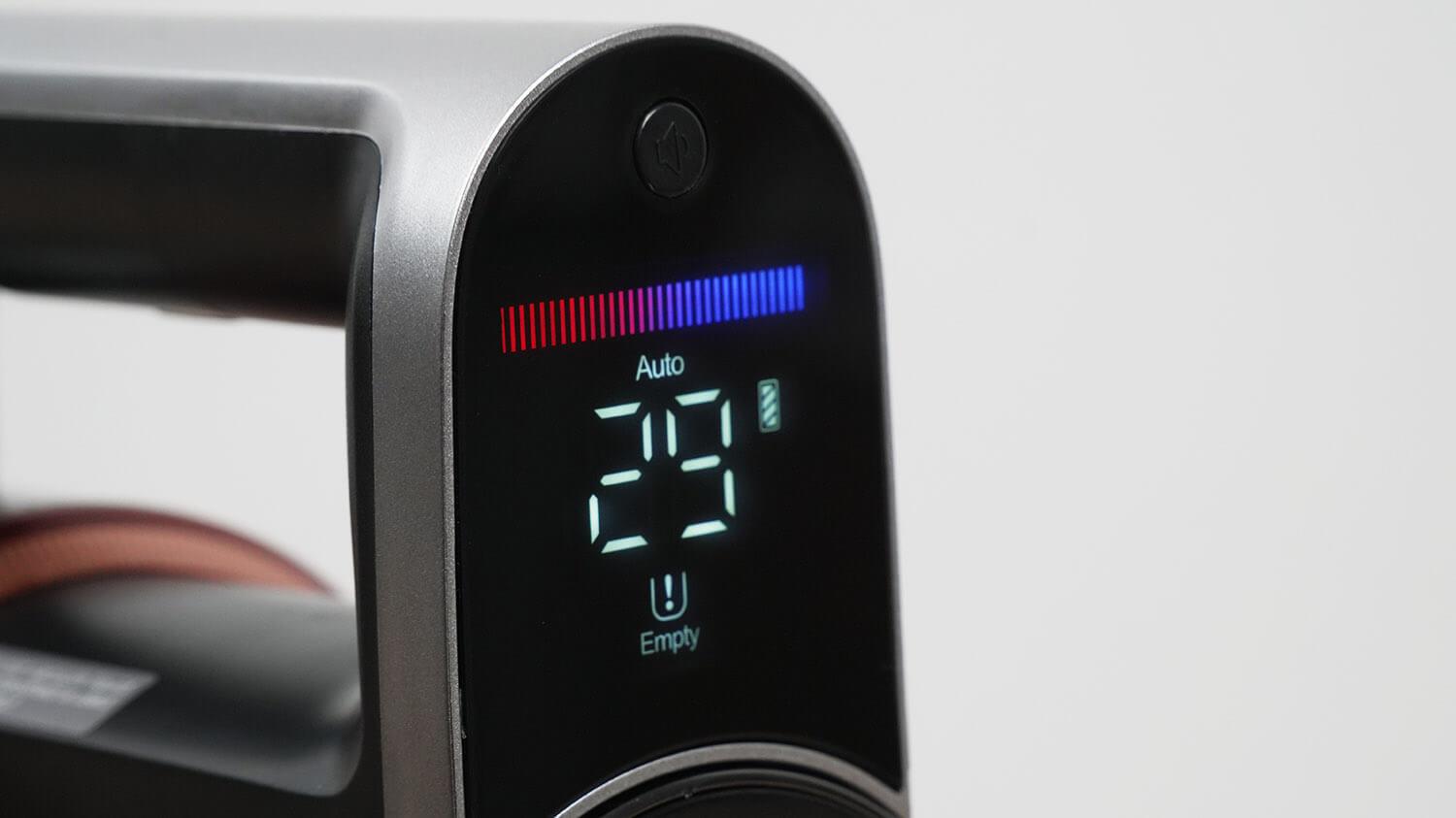 Rankinis dulkių siurblys turi atskirus valdymo mygtukus paleidimui / pristabdymui ir režimo perjungimui. Yra du režimai: normalus (dar žinomas kaip grindų) ir maksimalus (kilimų). Visa informacija rodoma ekrane.