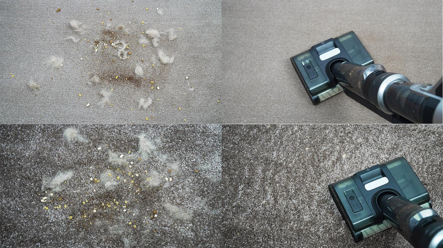Taip pat bandžiau juo valyti kilimus. Juo pavyko išvalyti trumpo plauko kilimus, bet vidutinio plauko kilimus jis nebuvo labai efektyvus, nes volelio konstrukcija nebuvo tinkama. Nors plauko paviršius buvo nuvalytas, viduje vis tiek buvo prilipusių šiukšlių.