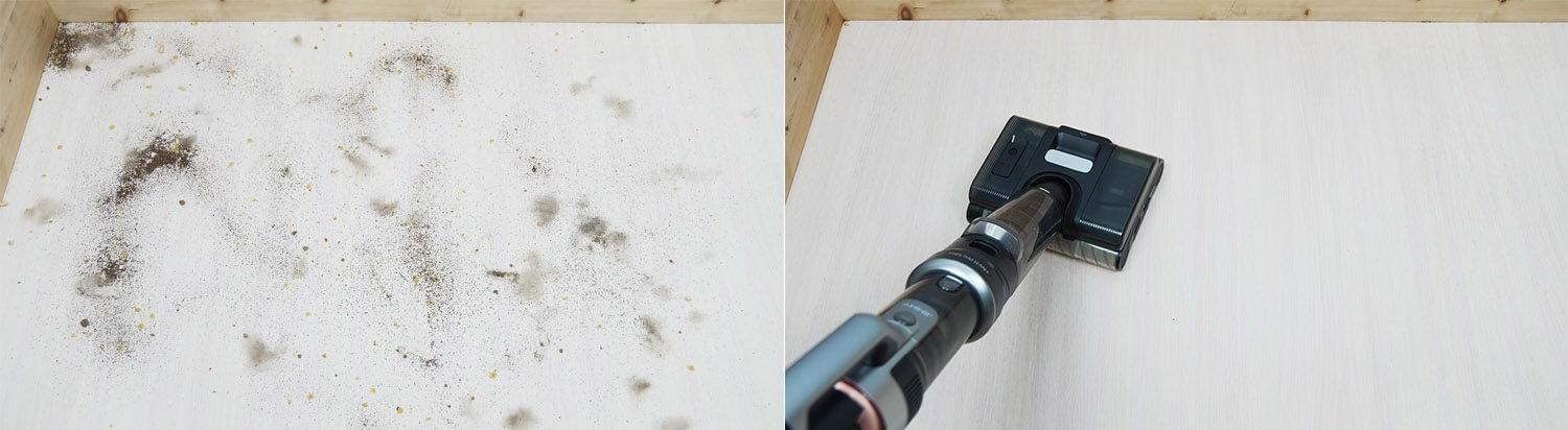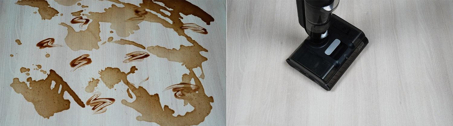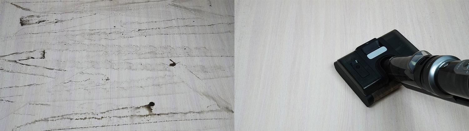 Jei reikia, šiuo dulkių siurbliu galima išvalyti šiek tiek pridžiūvusius nešvarumus nuo grindų. Matome, kad neliko jokių žymių ar dryžių. Grindys tampa idealiai švarios.