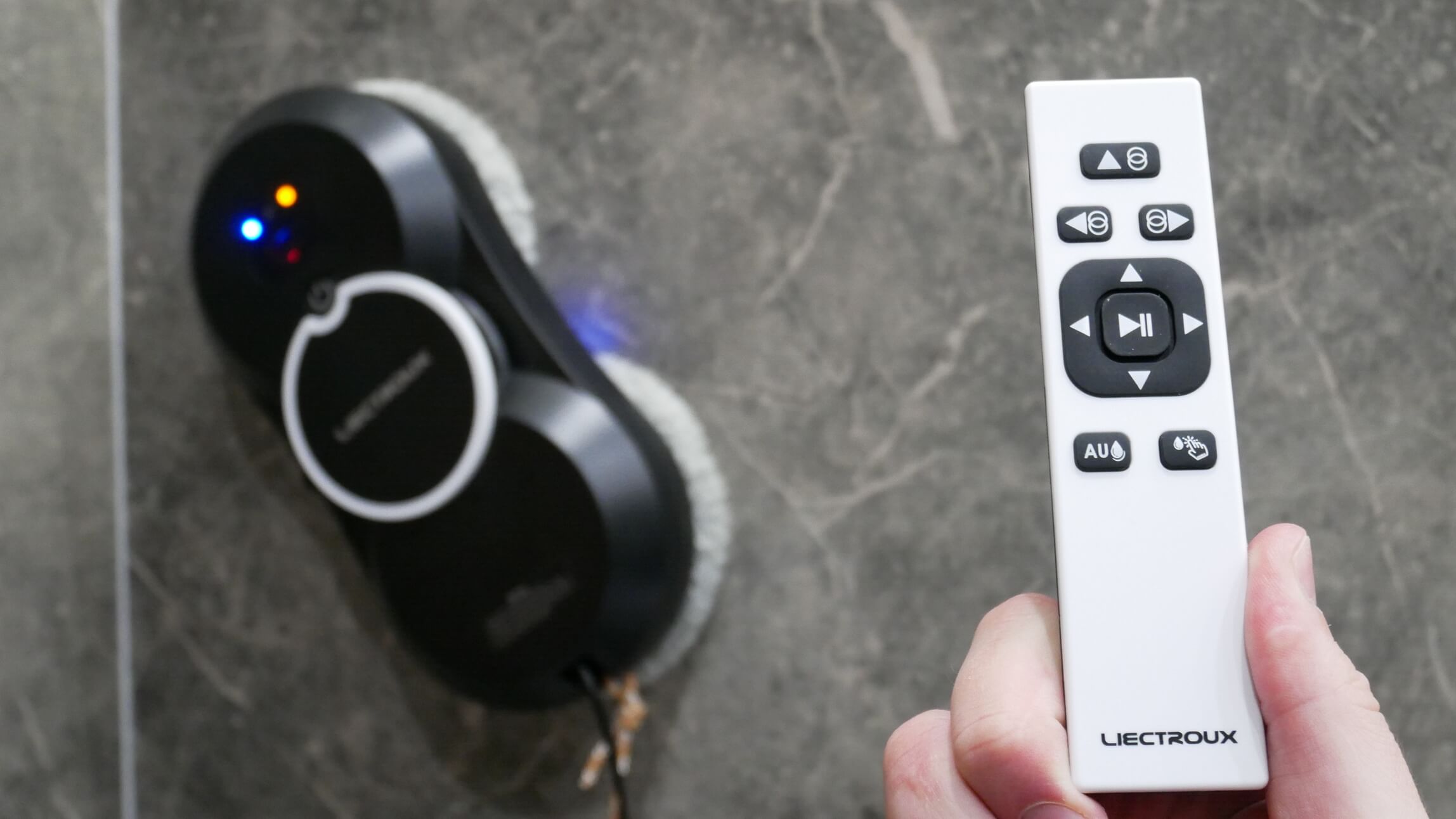 Pereikime prie „Liectroux HCR10“ funkcijų apžvalgos. Langų valymo robotas valdomas nuotolinio valdymo pultu. Nėra galimybės prisijungti prie mobiliosios programėlės, nors nematau didelės šios parinkties vertės, atsižvelgiant į tai, kad roboto negalima paleisti nuotoliniu būdu ir jam veikiant visada reikia būti šalia.