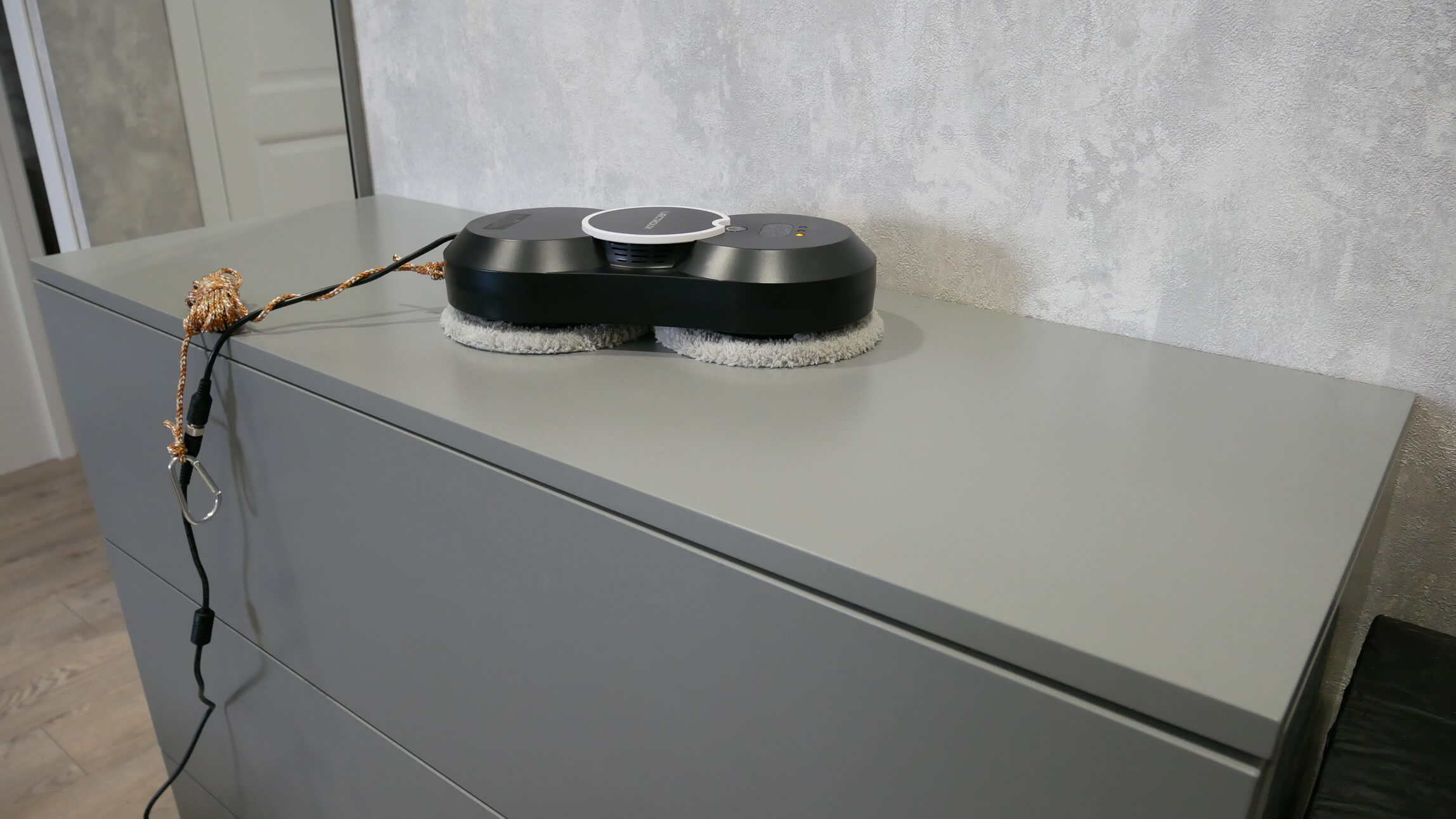 Beje, manęs dažnai klausia, ar avariniu režimu roboto siurbimo galia sumažėja. Taip! Bent jau šis robotas vos laikosi paviršiaus, kai veikia su atsarginiu maitinimo šaltiniu. Todėl, valydami robotą langams lauke, ypač butuose, būtinai pritvirtinkite apsauginį lyną prie kažko nejudančio. Pavyzdžiui, prie radiatoriaus ar stalo kojos.