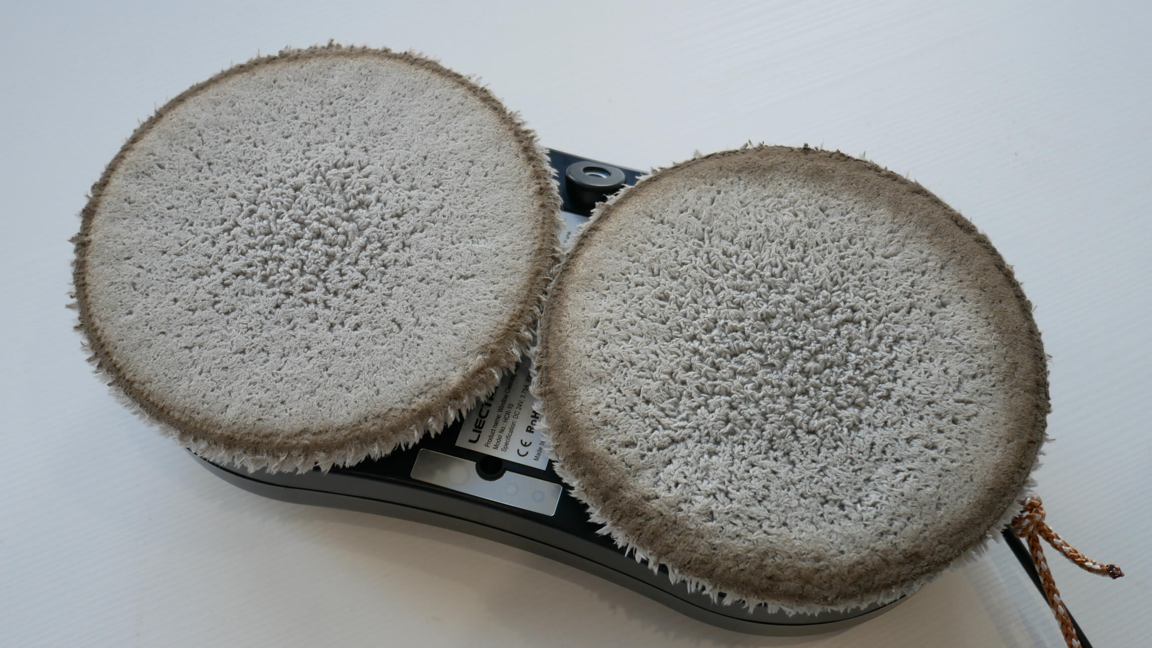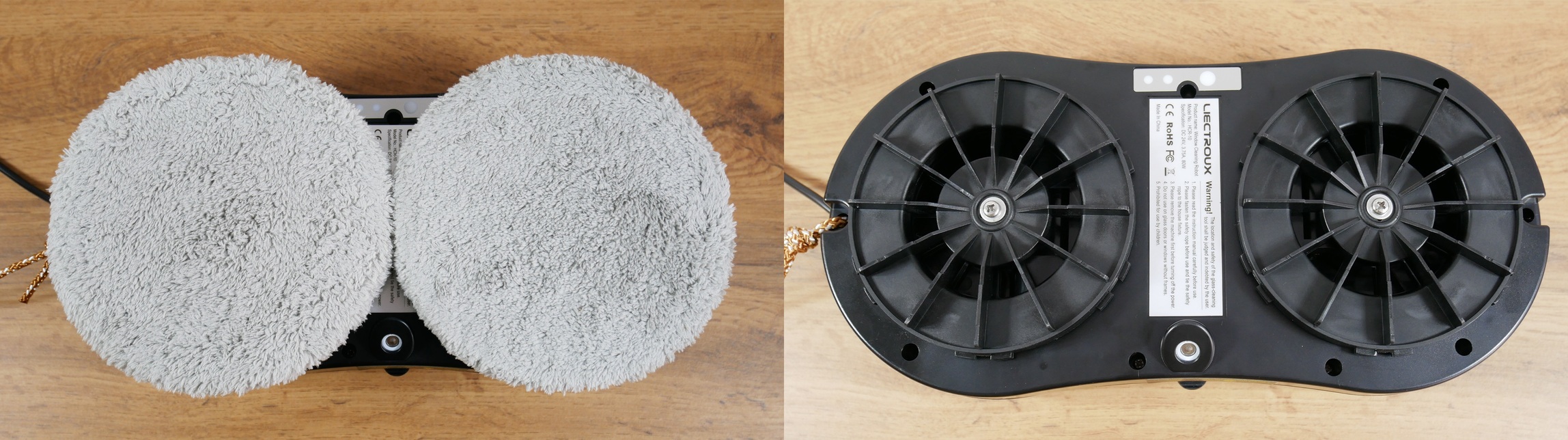 Dabar pažvelkime į „Liectroux HCR10“ dizainą. Šis ovalo formos langų valymo robotas turi valymo modulį, kurį sudaro du besisukantys diskai, laikantys apvalius laikiklius su valymo šluostėmis. Jo korpusas yra tik 68 mm aukščio, todėl jis tinka naudoti langams su grotomis.