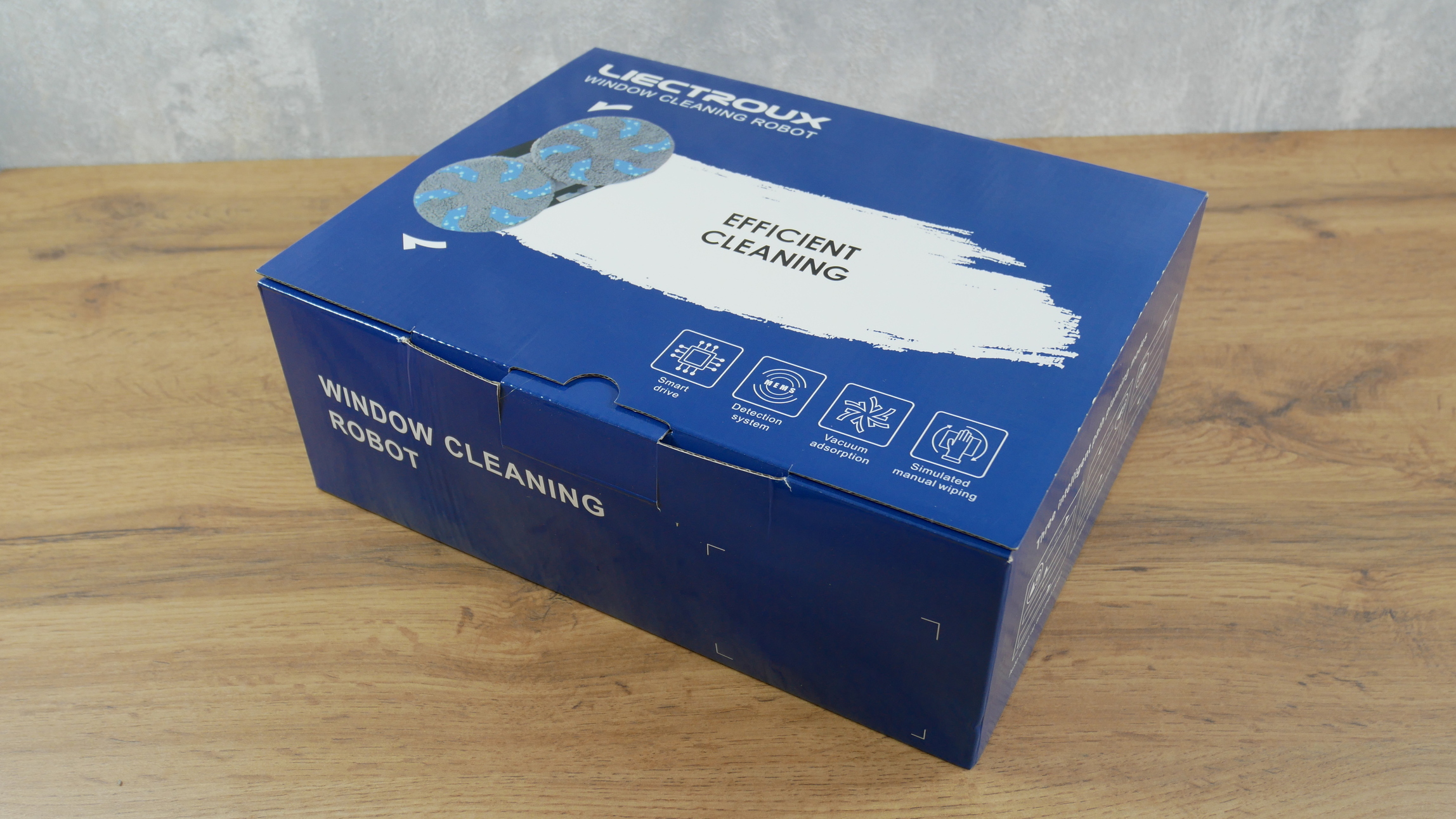 Langų valymo robotas supakuotas firminėje dėžutėje, tokioje kaip ši: