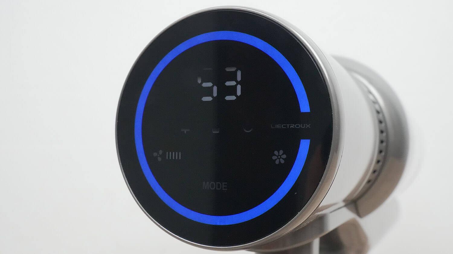 Įjunkite ir išjunkite nykščio mygtuko paspaudimu. Nereikia jo laikyti nuspausto. Visa informacija rodoma dideliame ekrane. Taip pat yra lietimui jautrus režimo jungiklis. Yra automatinis galios padidinimas, ekologinis, perėjimo ir turbo režimai.