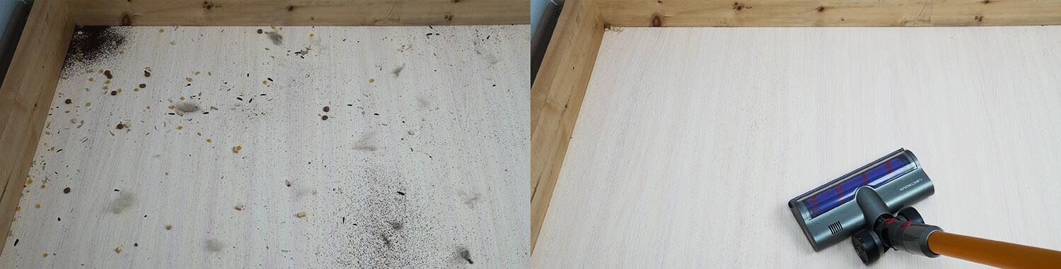 Dabar patikrinkime, kaip gerai „Liectroux i10“ surenka grindų šiukšles. Ant laminuotų grindų išbarsčiau įvairių rūšių šiukšles: plaukus, kailį, grūdus ir kitas smulkias buitines šiukšles. Jis surinko didžiąją dalį šių šiukšlių. Svarbu atkreipti dėmesį, kad kampe yra maža akloji zona, iš kurios volelis negali surinkti šiukšlių. Pats volelis po bandymo buvo švarus; ant jo nebuvo prilipę jokių plaukų ar kailio.
